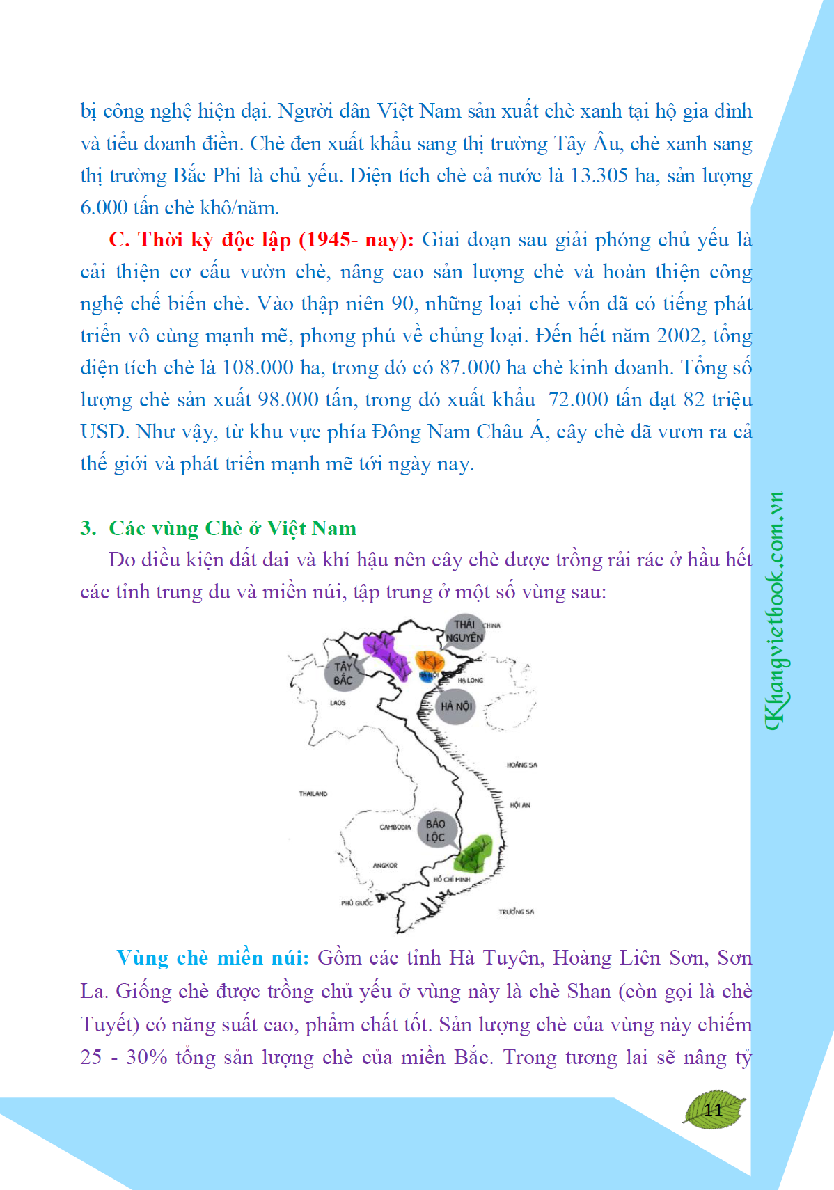 Ở các vùng Hà Tuyên, Hoàng Liên Sơn có trên 41.000 cây chè mọc hoang, thân to như cổ thụ, có cây bằng cây đa, đường kính tán rộng tới 14 mét và đường kính gốc cây tới 80 cm, có cây hai đến ba người ôm không xuể. Một điều khá lý thú là khí hậu, thời tiết, thổ nhưỡng đặc biệt ở nước ta đã mang lại cho những cây chè khổng lồ, còn sống tới bây giờ, những nét đặc trưng kỳ lạ. Có những cây có búp lá dựng đứng, nhưng cũng có cây búp lại nằm ngang hay chúc xuống phía dưới. Những cây chè này đã sinh ra bao đời con cháu rồi, nhưng sức vẫn như đang tuổi thanh xuân, mỗi năm vẫn cho thu hoạch 4 vụ, mỗi cây mỗi vụ thu được từ 20 đến 30 kg chè búp.