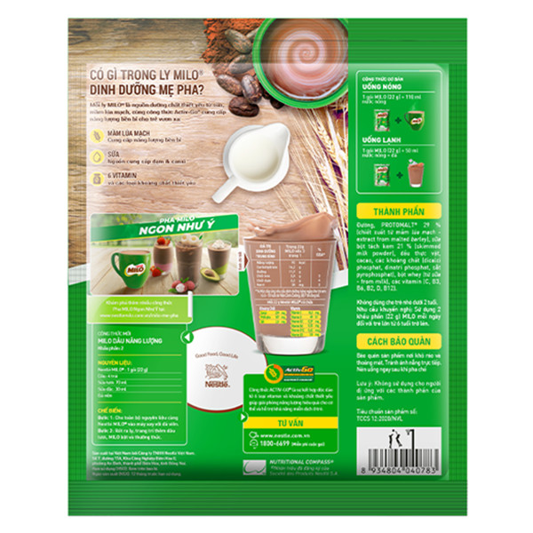 - Thức uống lúa mạch Nestlé Milo Nguyên chất với hợp chất Activ-Go vươn xa là sự kết hợp độc đáo của Protomalt - chiết xuất từ mầm lúa mạch - và tổ hợp các vitamin cùng khoáng chất thiết yếu, đóng vai trò quan trọng trong việc giải phóng năng lượng, tăng cường chức năng cơ và hệ xương, hỗ trợ tích cực cho các hoạt động thể chất và não bộ của trẻ.
