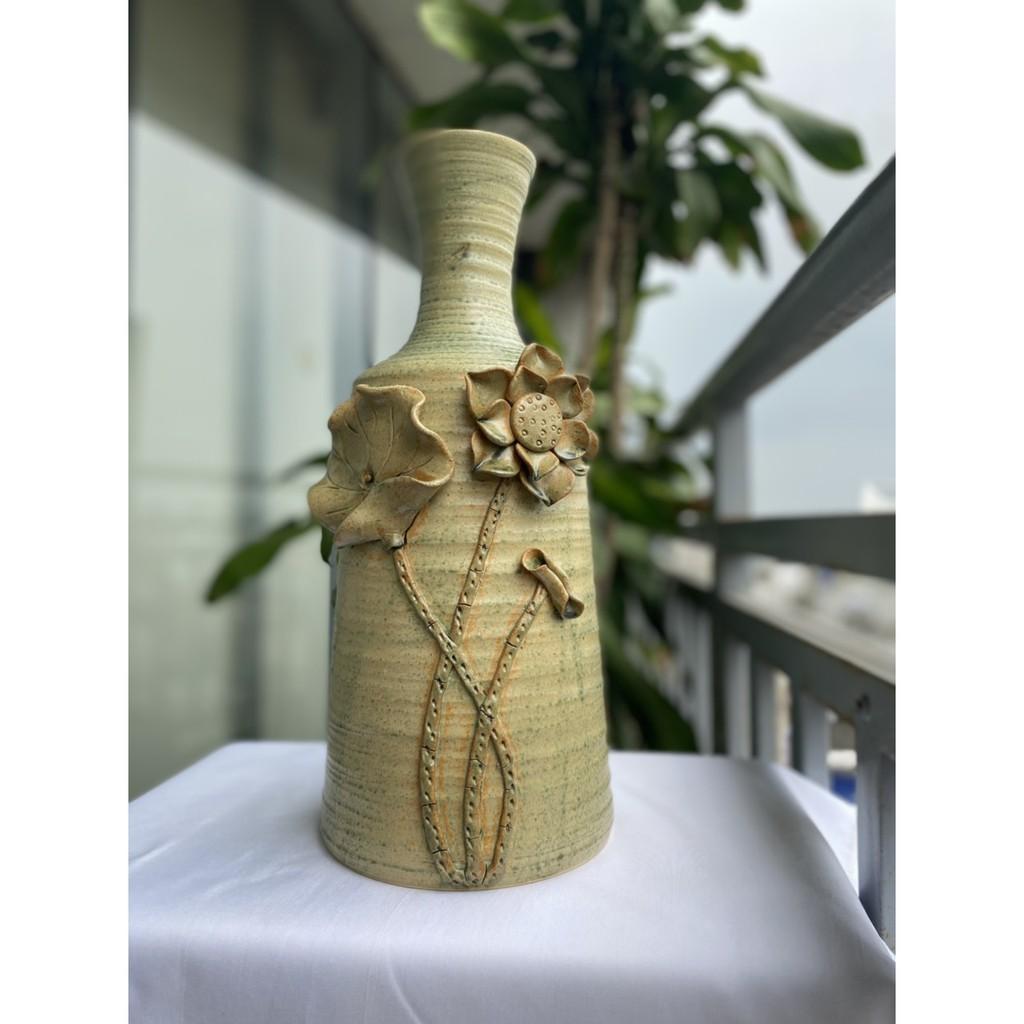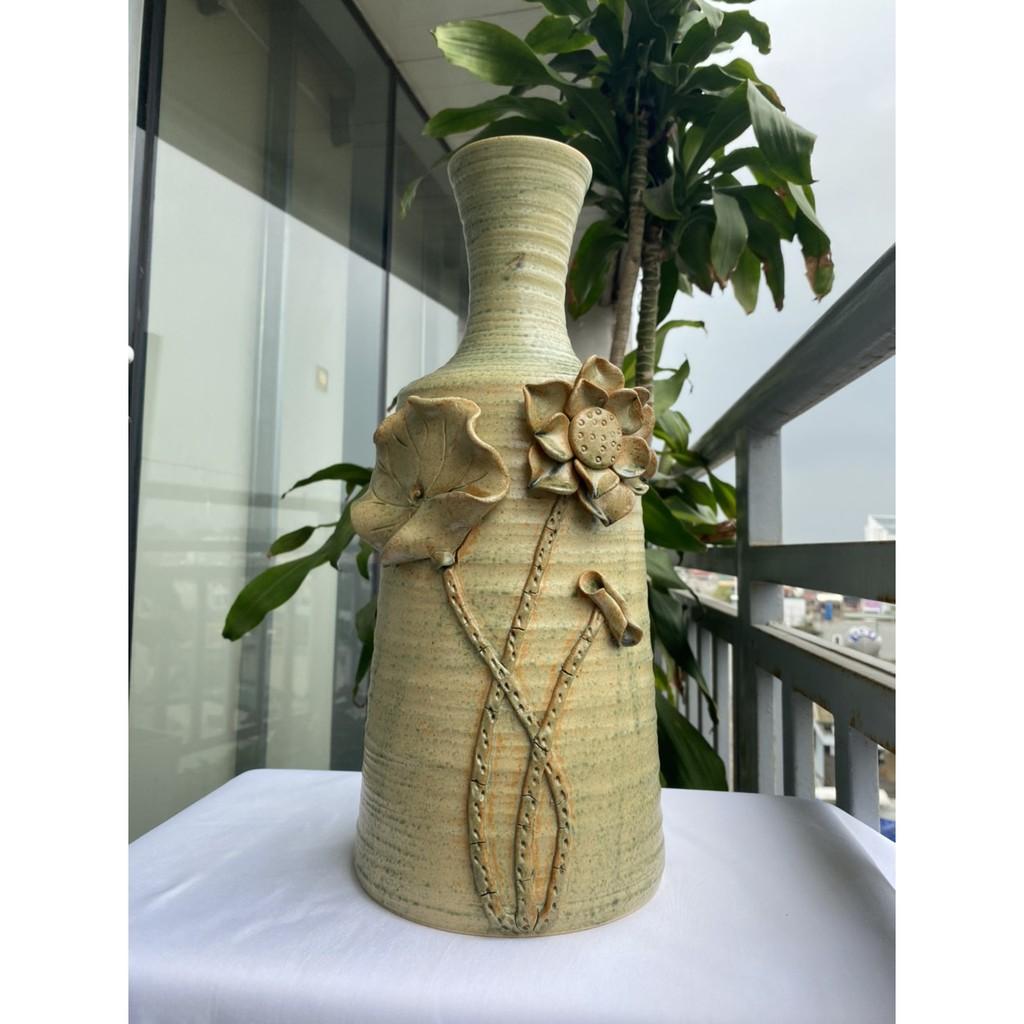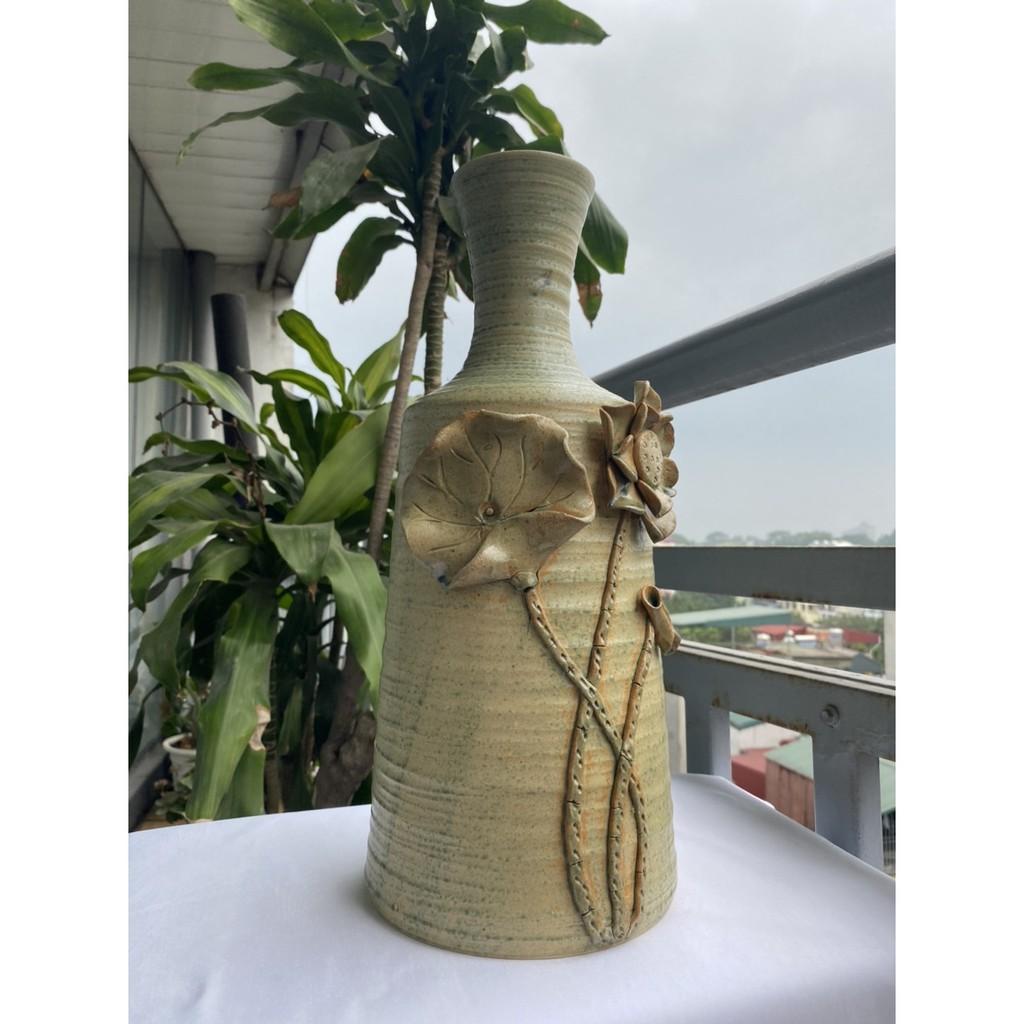 Bình hoa Bát Tràng cao cấp, hàng chuẩn loại 1, men hỏa biến với nước men căng bóng, sáng loáng, mịn màng. Bình màu xanh rêu nổi bật với họa tiết hoa đắp nổi trên