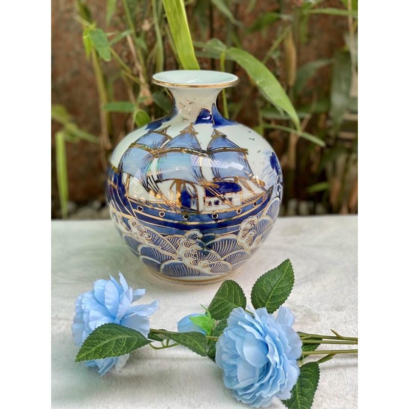 Bình hút tài lộc thuận buồm xuôi gió vẽ vàng 18k men xanh vân đá H25, H30 cm gốm sứ Bát Tràng tặng kèm đế gỗ - NHẤT MỆNH - NHÌ VẬN - TAM PHONG