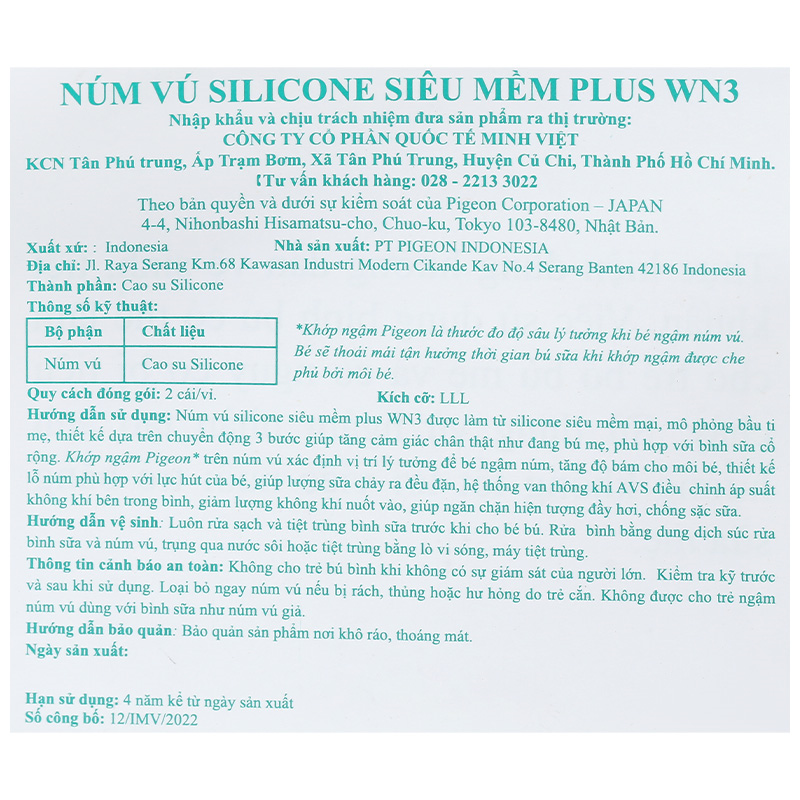 Với thiết kế lỗ sữa chữ Y phù hợp với lực hút của bé, giúp lượng sữa chảy ra đều đặn, tự nhiên, sản phẩm phù hợp cho bé trong giai đoạn đang phát triển cơ hàm. Sản phẩm tương tự: bình Pigeon Hướng dẫn sử dụng Sử dụng núm ti phù hợp với lứa tuổi của bé. Trước khi sử dụng cần phải rửa sạch và tiệt trùng núm ti trong nước sôi từ 3 - 5 phút hoặc máy tiệt trùng chuyên dụng, lò vi sóng.   Dùng dụng cụ thông núm ti kèm theo để thông lỗ sữa và van thông khí tránh cặn bám vào.   Sau khi sử dụng rửa sạch núm ti bằng nước sôi hoặc các dung dịch chuyên dùng cho núm ti.   Không sử dụng sản phẩm như ti ngậm, khi bé dùng cần có sự theo dõi của người lớn.   Hướng dẫn bảo quản Kéo nhẹ núm ti thường xuyên để kiểm tra độ đàn hồi.   Không sử dụng núm ti có dấu hiệu mòn hoặc hư hỏng.   Thay mới sau khi sử dụng từ 1 - 2 tháng.   Bảo quản sản phẩm nơi khô ráo, thoáng mát, tránh nhiệt độ cao và ánh nắng trực tiếp.