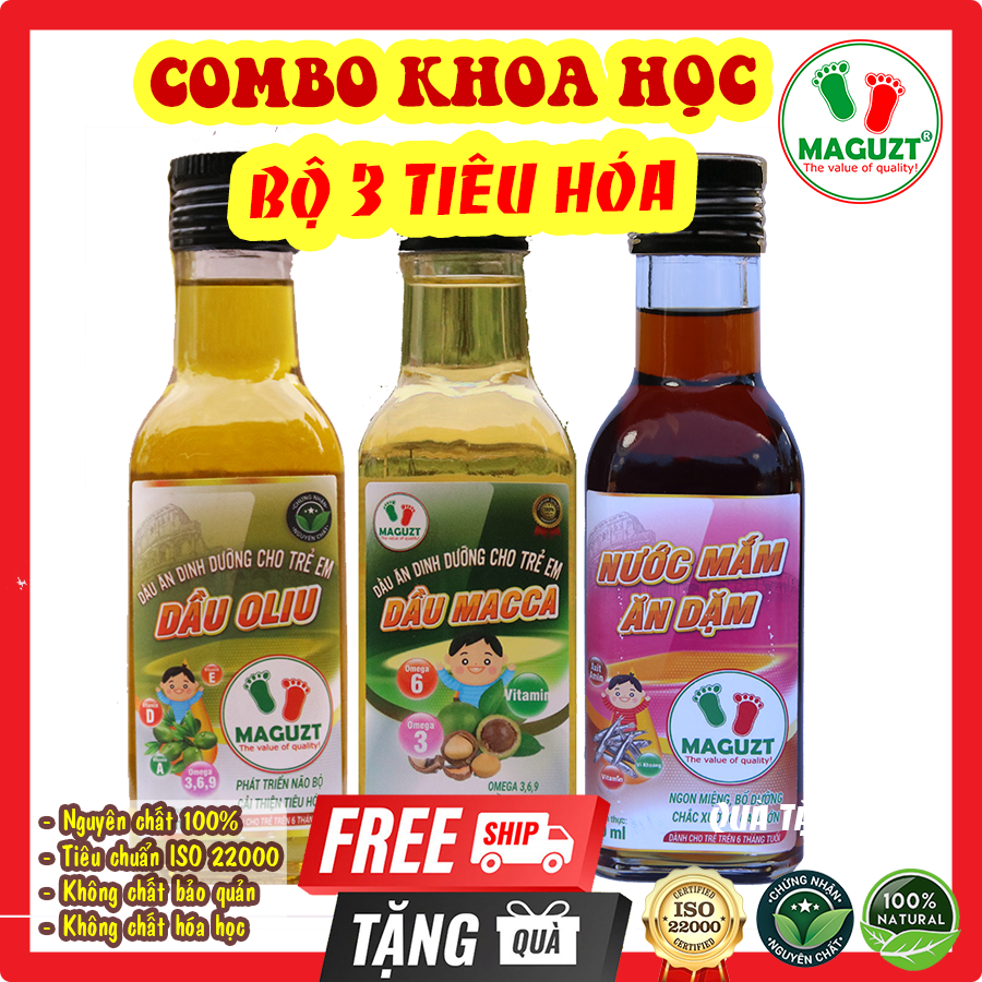Bộ 3 dầu ăn dặm cho bé hiệu quả bao gồm Dầu Oliu, Dầu Macca và nước mắm.
