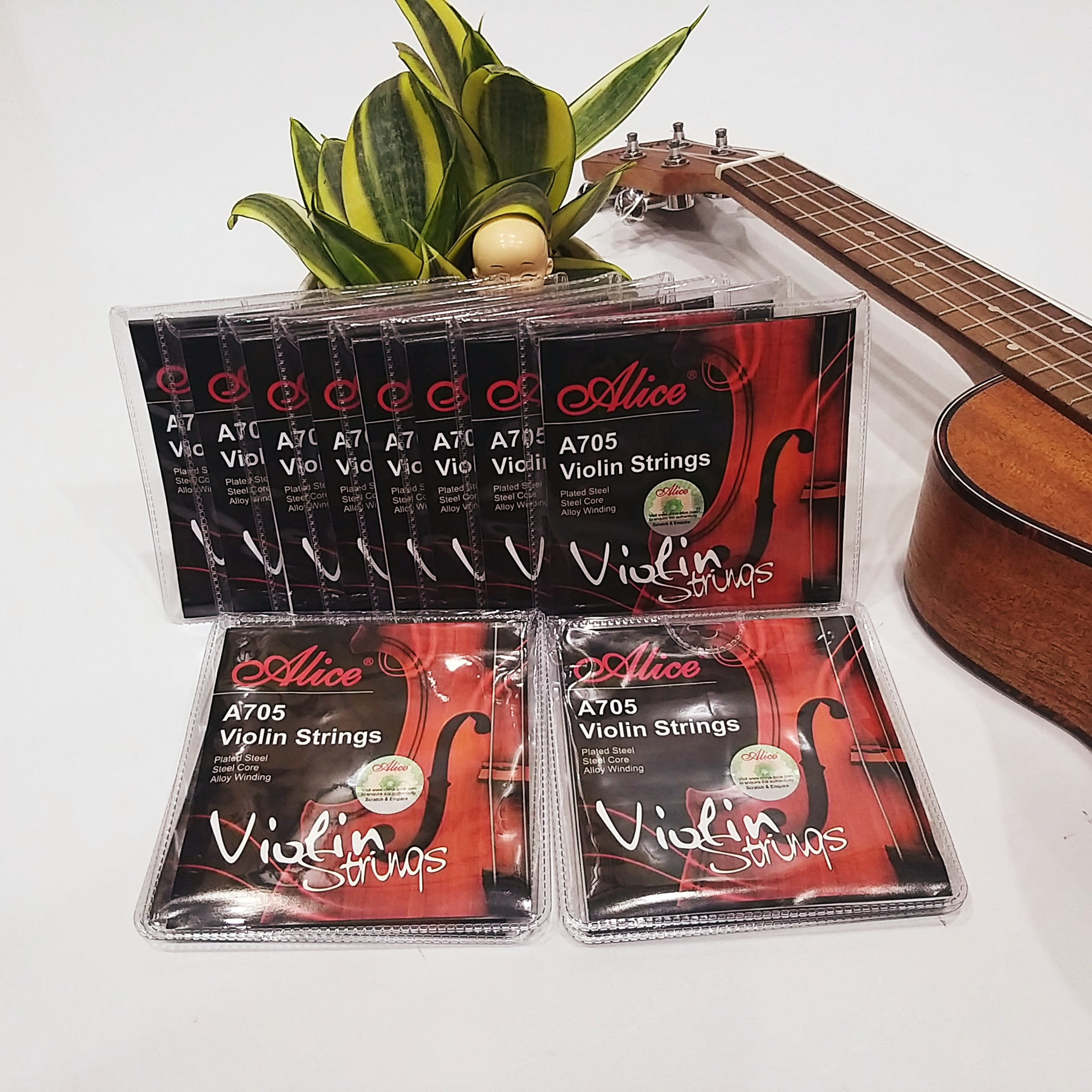 Dây đàn violin Alice A705 Gồm 4 dây, được sản xuất theo tiêu chuẩn riêng của hãng Alice Dây đàn violin  Alice A705 được chế tác bằng kỹ thuật hiện đại, đảm bảo độ căng theo tiêu chuẩn của hãng Alice, giúp người chơi kiểm soát tốt từng nốt nhạc khi trình diễn. Sản phầm gồm 4 dây, dây E được làm từ thép không gỉ, có độ bền cao. Dây A,D,G có lõi làm từ thép mạ nickel chrome có độ ổn định tốt, dễ bấm. Có độ linh hoạt cao Dây đàn violin Alice A705 có âm sắc tươi sáng, khả năng cộng hưởng âm tốt. Sản phẩm được đánh giá cao về độ linh hoạt khi sử dụng. Vì dây đàn sẽ quyết định hỗ trợ hoặc làm hỏng âm thanh và lối chơi violin của bạn nên cần được lựa chon cẩn thận. Cách thay dây violin Khi thay dây violin, những người mới thay lần đầu thường tháo hết tất cả dây đàn ra rồi thay vào từng dây một. Tuy nhiên, điều đó hoàn toàn không chính xác, làm như vậy có thể dẫn đến sập phím đàn hoặc soundpost. Nên bắt đầu thay từ dây G rồi lần lượt cho tới dây E. Nếu dây đàn của bạn có tăng đơ, lắp dây đàn vào tăng đơ rồi kéo về phía chốt đàn. Nếu dây đàn không có tăng đơ, đưa phần cuối của dây đàn vào lỗ trên miếng gỗ căng dây đàn. Kéo mạnh dây để chắc chắn là bóng của dây đàn đã nằm chắc chắn ở trong khe gỗ. Sau đó, kéo dây đàn về phía chốt, nhớ giữ quả bóng trong khi lên dây đàn cho tới khi dây đàn thít chặt vào. Hơi nới chốt đàn ra để lên dây đàn cho dễ, khi dây gần đạt được độ căng cần thiết mới bắt đầu nhét vào sau cho chặt. Tăng đơ thường chỉ được lắp cho dây E nhưng các nghệ sĩ violin lại lắp ở tất cả các dây đàn để tiện lên dây. Khi phải thay tất cả các dây đàn, các nghệ sĩ violin thường chỉnh chốt đàn cho gần đúng, rồi dùng tăng đơ để chỉnh cho chính xác hẳn. Nhớ là khi thay dây đàn mới, chốt đàn mới sẽ dễ bị tuột hơn những chốt đàn cũ, chúng ta sẽ phải điều chỉnh nhiều hơn. Nếu chốt đàn của bạn bị trượt hay quá chặt, bạn có thể tìm mua dầu bôi chốt đàn để bôi lên chốt. Nếu bạn không có dầu bôi chốt, bạn có thể giải quyết tạm thời bằng cách sau:- Với chốt quá chặt, bạn có thể rút ra và tô bút chì vào chốt.- Với chốt quá lỏng, rút chốt ra rồi bôi sáp nến vào thân chốt. Nên để một bộ dây dự phòng trong hộp đàn để đề phòng dây đàn bị đứt. Mỗi loại dây violin sẽ mang lại những âm thanh khác nhau. Bạn nên thử nhiều loại dây đàn và chọn ra loại dây thích hợp của mình