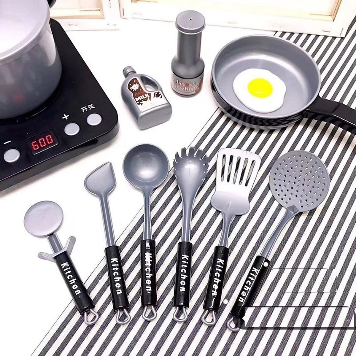 Các chi tiết của đồ chơi được thiết kế và phủ lên một lớp sơn bạc giống như những dụng cụ nấu ăn thật. Bộ nấu ăn đồ chơi 36 món có đầy đủ như nồi, chảo, đủa, thìa, bếp và có kèm theo những mô hình thức ăn như trứng, gà, bắp, xúc xích.