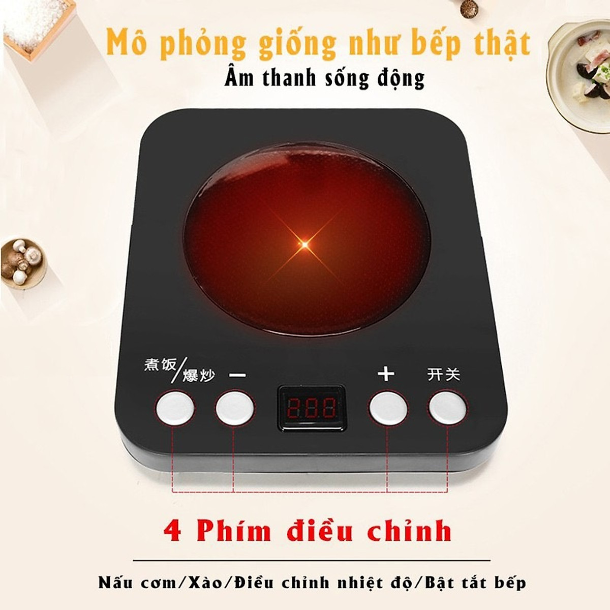 Với chiếc bếp từ sử dụng pin có đèn led hiển thị nhiệt độ, nút bấm tăng giảm như thật, số hiển thị trên màn led sinh động. Nồi áp suất có chốt khóa. Nồi niêu toàn size 14, 16, 18 cm gần bằng nồi thật. Nếu mẹ để ý, mẹ sẽ thấy những món mà bé yêu thích qua bộ đồ chơi trẻ em này đó.