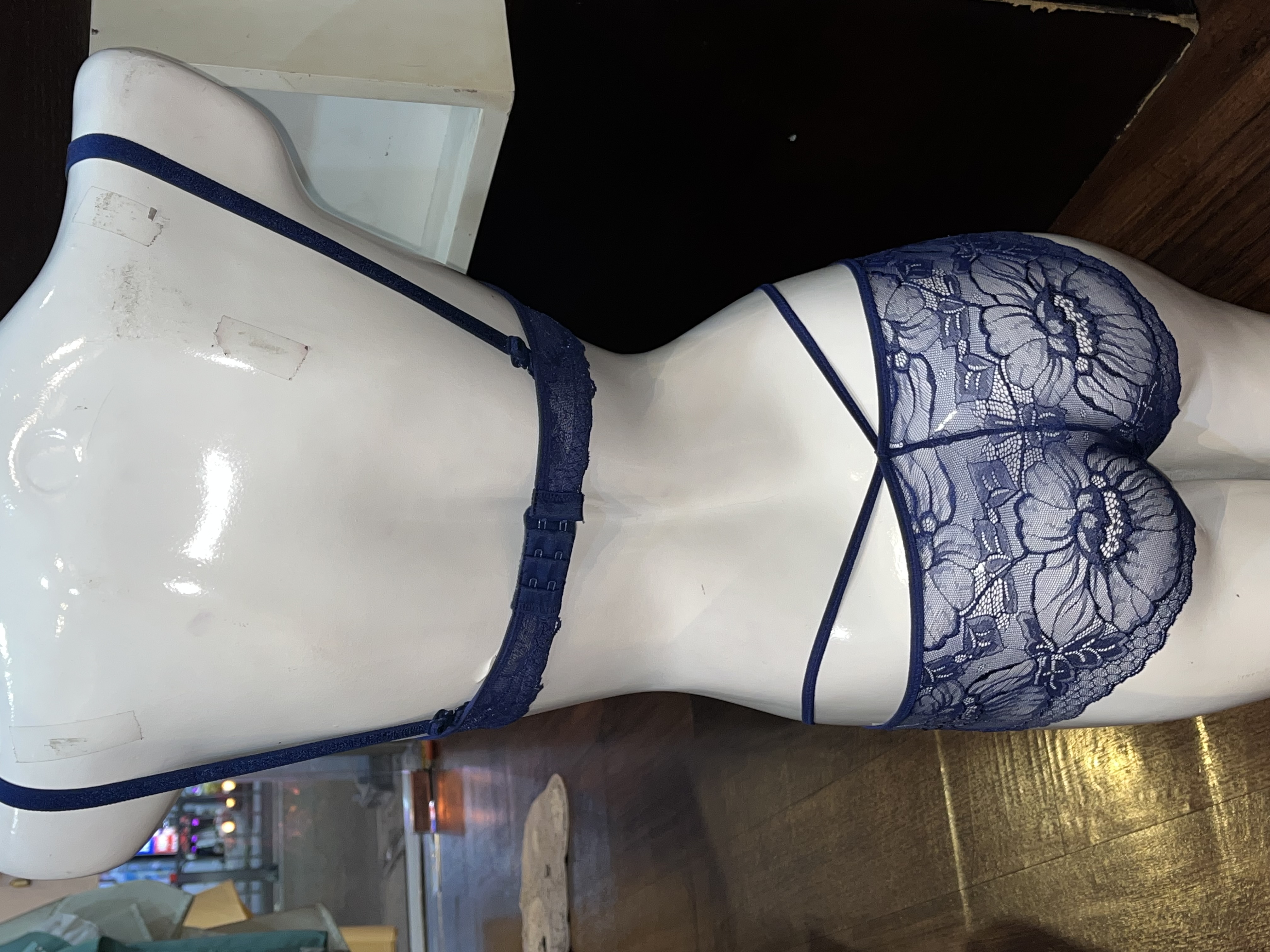 Màu sắc: Xanh Đen có nết họa tiết vàng Chất liệu: Ren mềm BRA: Fresize và có tăng đơ điều chỉnh độ rộng, móc gài sau lưng QUẦN Chữ Y/Đùi: - S: V3 dưới 80cm