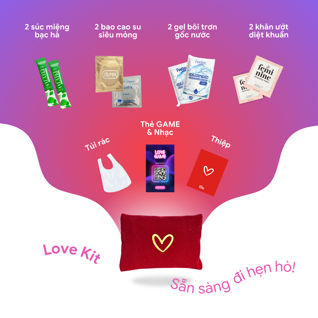 Love Kit là một ví nhung nhỏ gọn kích thước 12x8 cm, tiện lợi cho vào túi xách để đem đi khắp nơi như đi du lịch, đi hẹn hò, đi bar, cắm trại, Love Kit còn là món quà tặng thiết thực mà bố mẹ tặng cho con trong sinh nhật 18 tuổi. Ví chứa các vật dụng cần thiết cho câu chuyện tình yêu của bạn: