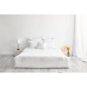 - Bạn sẽ cảm nhận sự mềm mại của loại vải Tencel từ lần chạm đầu tiên, mang đến cảm giác thoáng mát, nhẹ nhàng trong quá trình sử dụng. Những sợi vải mảnh mai được liên kết với nhau một cách chặt chẽ, giúp cho Tencel có độ bền cao gấp 2 lần so với Cotton thông thường. Cũng trên nền trắng là những chùm hoa trắng được thêu tay khá tỉ mẩn và chăm chút, không quá nổi bật nhưng đủ để ánh lên sự thanh lịch và sang trọng cho bộ sản phẩm cũng như không gian chứa đựng nó. Bộ sản phẩm sử dụng vải Tencel làm nguyên liệu hình thành. Bản thân Tencel là loại vải mang đậm dấu ấn của tự nhiên, được chiết xuất từ các loại cây giàu xenlulozo, thân xốp, nhiều sợi như khuynh diệp, bạch đàn, tre… nguyên liệu thành phẩm được xử lý nghiền thành bột và kéo sợi thông qua công nghệ Nano… tạo ra Tencel an toàn tuyệt đối cho sức khỏe người dùng, và thân thiện với môi trường sinh thái. Là màu được sử dụng khá rộng rãi trong thiết kế nội thất của phần lớn các gia đình. Màu trắng là màu của sự giản đơn, có thể phù hợp với nhiều không gian nội thất khác nhau, tạo thành một tổng thể hài hòa và cân đối.