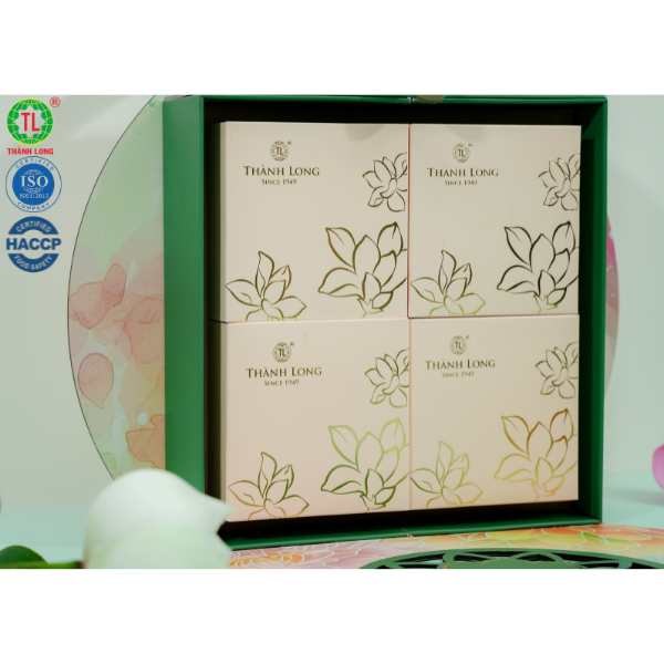 COMBO SUPER A5 - Thành Long gồm 4 bánh : - Nhân đậu xanh1 trứng (150g) - Nhân hạt sen 1 trứng (150g) - Nhân khoai môn 1 trứng (150g) - Nhân dừa sầu riêng