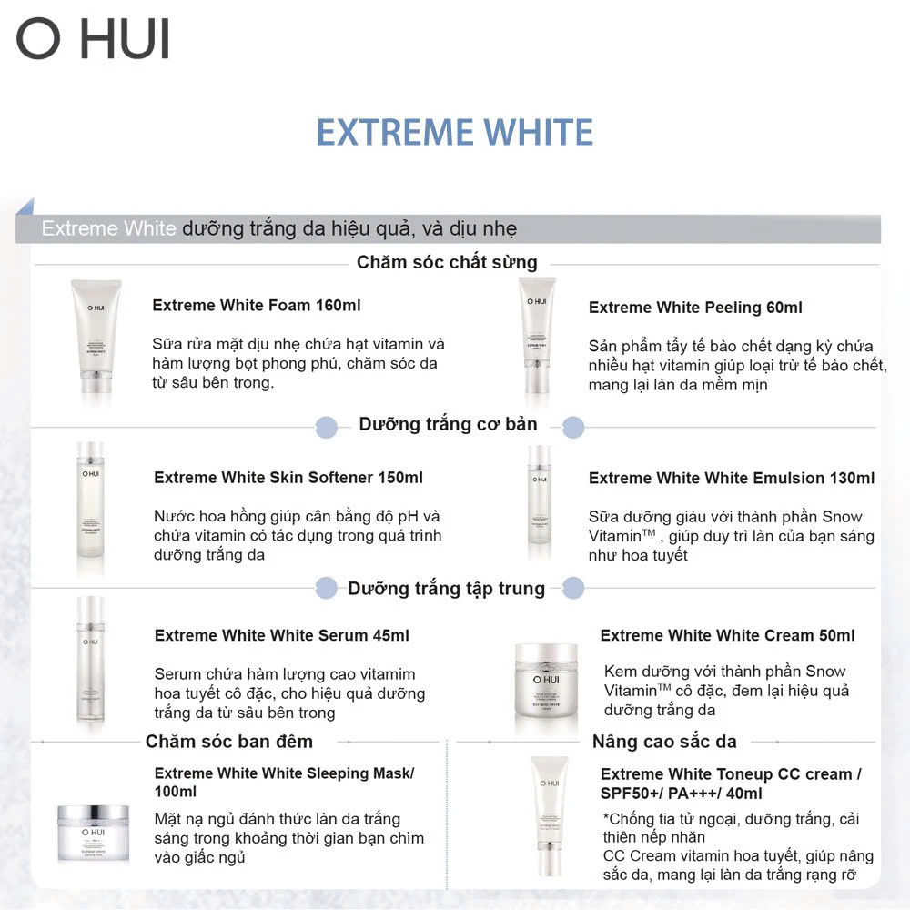 Bộ sản phẩm gồm: Kem dưỡng Ohui Extreme White Cream 50ml + 20ml Sữa rửa mặt Extreme White Foam 40ml Sữa dưỡng Extreme White Emulsion 20ml Nước hoa hồng Extreme White Skin Solftener 20ml Thành