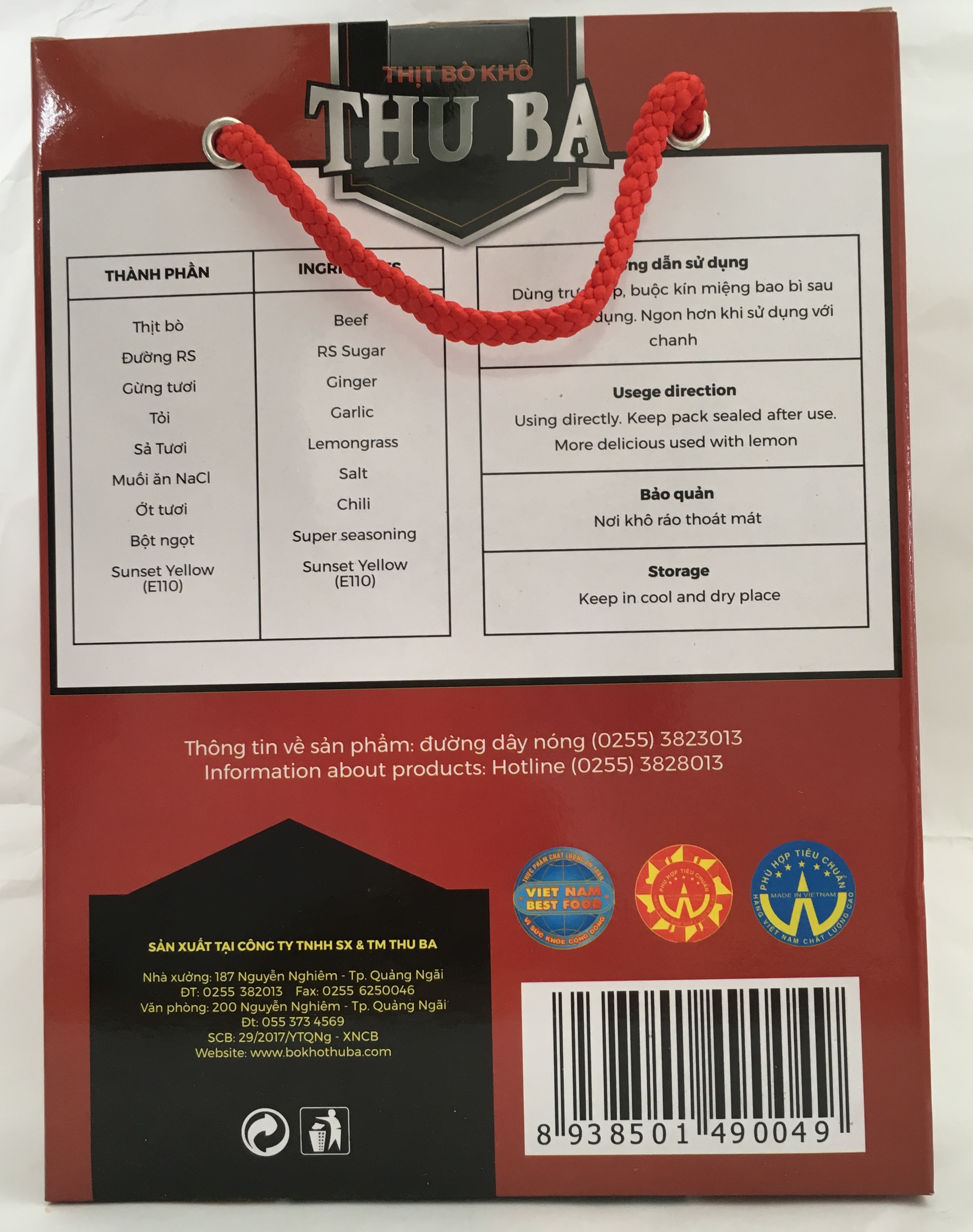 BÒ KHÔ THU BA là món đặc sản Quảng Ngãi, đạt tiêu chuẩn ISO 22000:2018 và là Hàng Việt Nam Chất Lượng Cao do Người tiêu dùng bình chọn Sản phẩm được sản xuất theo công thức
