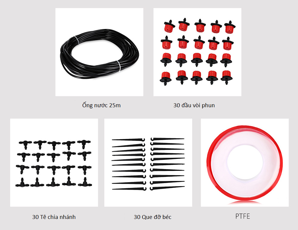 - Khi bộ chuyển đổi vòi và nước của bạn mở, nó có thể được tưới tự động. Bộ sản phẩm bao gồm: 01 Ống nước 25m 30 Đầu tưới 30 Que đỡ béc 30 Tê chia nhánh 03 Đầu chuyển van 01 Cuộn băng tan