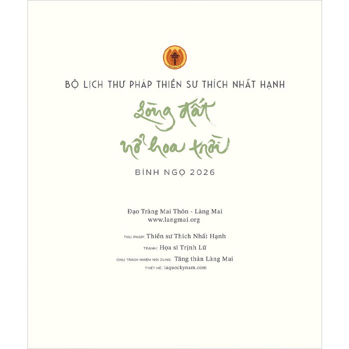 Bộ Lịch Thư Pháp Làng Mai - Bính Ngọ 2026 “Trên mảnh đất tâm, hoa hiểu biết và thương yêu nở.” - Thiền sư Thích Nhất Hạnh Một năm mới bắt đầu từ sự trở về Khi xuân về, vạn vật như được làm mới - cành cây đâm chồi, hoa lá nở rộ, lòng người nhẹ nhõm. Trong khoảnh khắc giao mùa ấy, “Lòng đất nở hoa trời” - một hình ảnh đầy chất thơ gợi mở mối liên hệ sâu sắc giữa “đất” (thân tâm ta, nơi tiếp xúc với hiện tại) và “trời” (chánh niệm, an nhiên, hiểu biết và từ bi). Hạnh phúc không ở đâu xa, mà hiện hữu ngay nơi từng bước chân, từng hơi thở. Khi ta biết trở về, sống sâu sắc và thật sự tiếp xúc với hiện tại - đất hóa trời, khổ đau hóa an lạc, hoa giác ngộ nở rộ từ trong lòng đất mộc mạc. Bộ lịch thư pháp 2026 - Món quà nuôi dưỡng thân tâm Năm nay, Tăng thân Làng Mai cùng  trân trọng gửi đến bạn ấn phẩm lịch đặc biệt với chủ đề “Lòng đất nở hoa trời”. Mỗi tờ lịch không chỉ là một mốc thời gian, mà còn là một cánh cửa nhỏ dẫn về chánh niệm - nhắc ta dừng lại, thở sâu và sống thật. Mỗi tháng - Một thông điệp nuôi dưỡng Lịch gồm 12 thông điệp thư pháp nhẹ nhàng, sâu sắc từ  như: Thở đi con, thở thật sâu thật chậm, không sao đâu; Lắng nghe; Con về nương tựa đất Mẹ; Lòng hôm ấy sẽ là lòng muôn thuở; Đây là một giây phút hạnh phúc…kết hợp cùng tranh hoa sen của hoạ sĩ  - biểu tượng của giác ngộ và thanh tịnh, nở lên từ lòng đất, như nhắc ta: hạnh phúc và hiểu biết có thể bắt đầu từ chính nơi ta đang đứng. Món quà tinh thần cho chính bạn và người thương Hãy để bộ lịch “Lòng đất nở hoa trời” trở thành người bạn đồng hành trong năm mới - nhẹ nhàng nhắc nhở bạn quay về với chính mình, mỗi ngày. Thông tin chi tiết Lịch treo tường:
