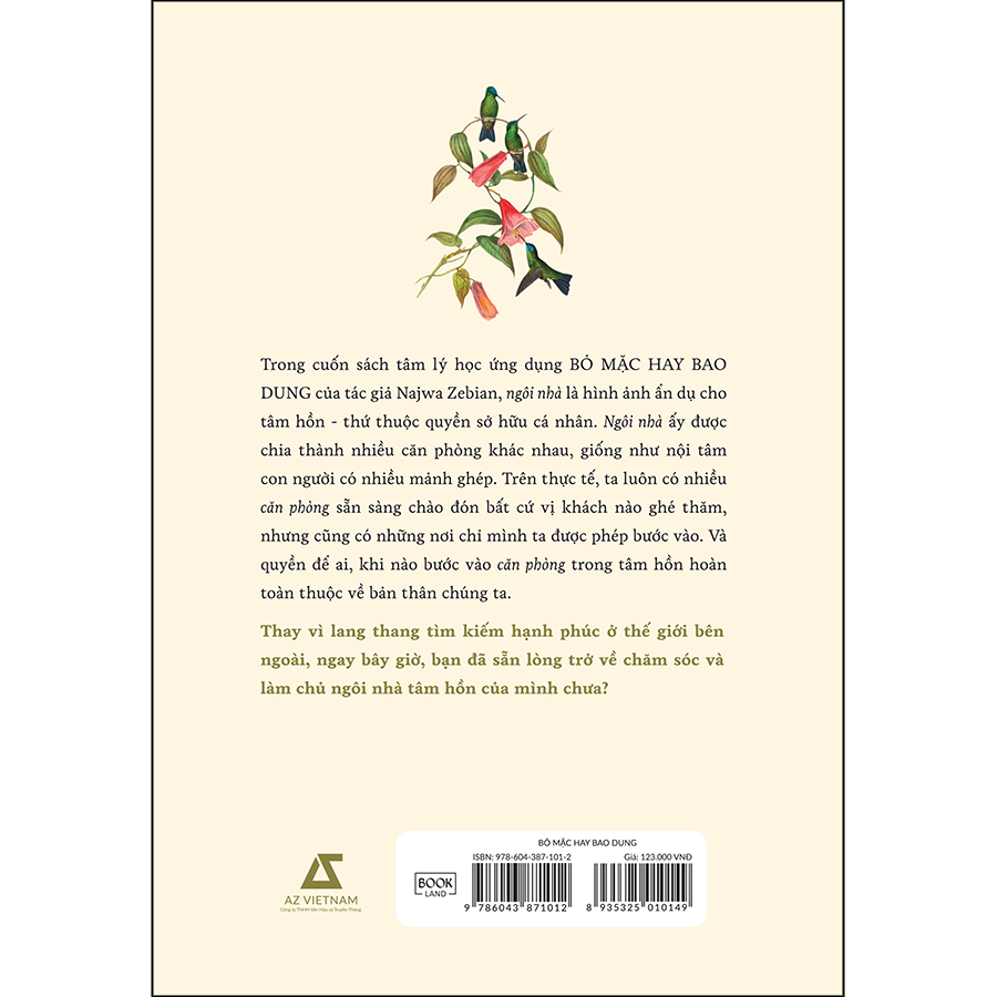 Trong cuốn sách tâm lý học ứng dụng BỎ MẶC HAY BAO DUNG của tác giả Najwa Zebian, “ngôi nhà” là hình ảnh ẩn dụ cho tâm hồn - thứ thuộc quyền sở hữu cá nhân. Ngôi nhà ấy được chia thành nhiều căn phòng khác nhau, giống như nội tâm con người có nhiều mảnh ghép. Trên thực tế, ta luôn có nhiều căn phòng sẵn sàng chào đón bất cứ vị khách nào ghé thăm, nhưng cũng có những nơi chỉ mình ta được phép bước vào. Và quyền để ai, khi nào bước vào căn phòng trong tâm hồn hoàn toàn thuộc về bản thân chúng ta. Qua cuốn sách này, tác giả cung cấp những kiến thức hữu dụng về cấu trúc của “ngôi nhà tâm hồn” để bạn có thể tùy chỉnh hành trình thay đổi chính mình. Đồng hành với những chia sẻ của Najwa Zebian về kinh nghiệm xây dựng ngôi nhà nội tâm, bạn sẽ biết cách tu sửa lại những “căn phòng” sau của chính mình: