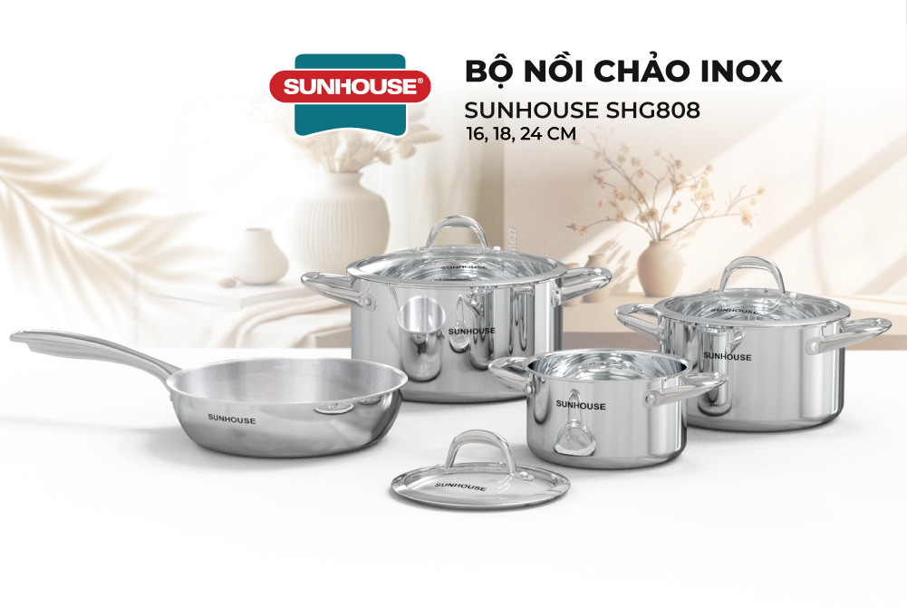 ✨Bộ Nồi Chảo Inox 304 Đáy Liền Sunhouse SHG808