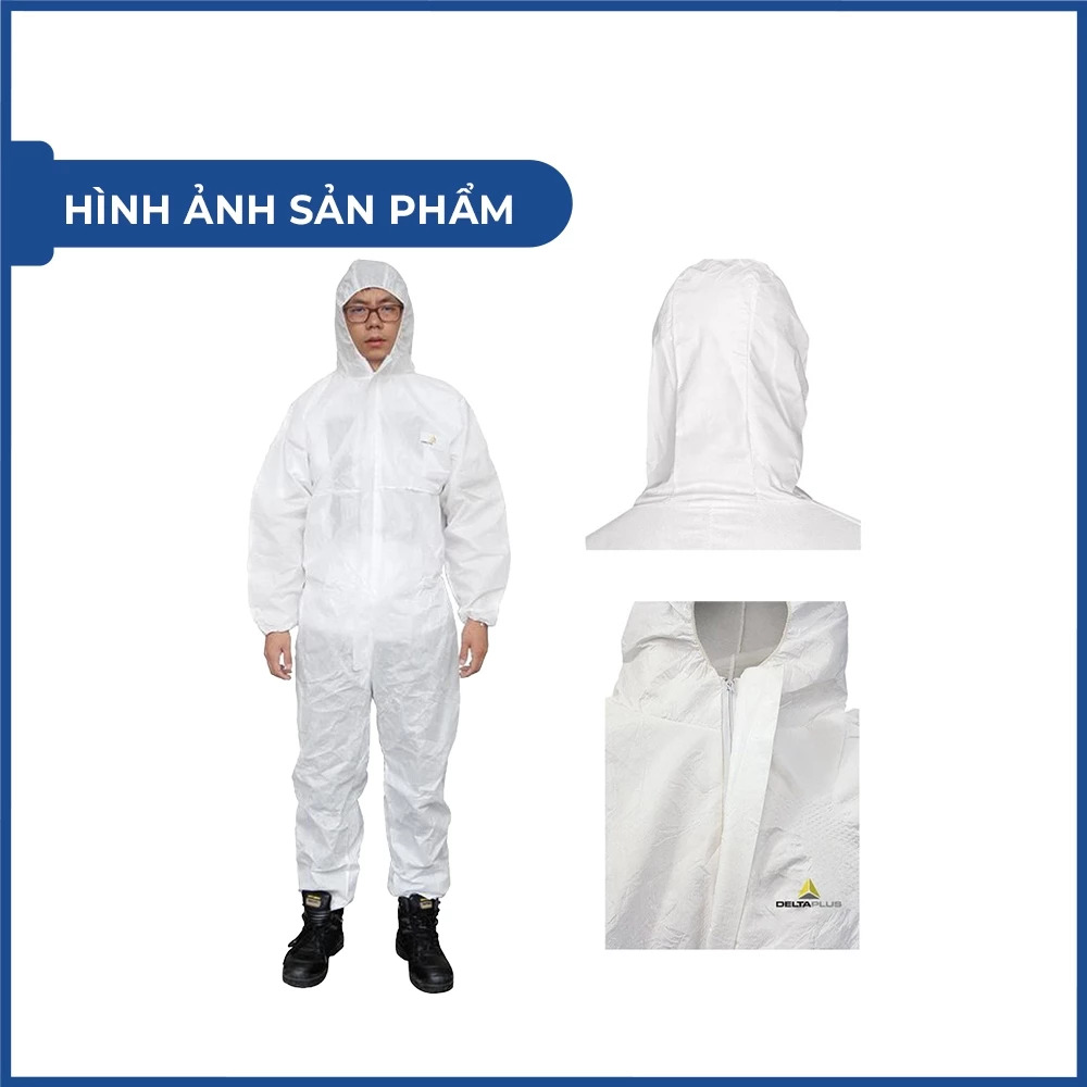 QUẦN ÁO CHỐNG HÓA CHẤT DELTAPLUS DT117 - Chất liệu: Vải không dệt DELTATEK 5000 (70% polypropylene + 30 % polyethylene) - Chống tất cả các loại bụi, vi khuẩn độc hại và hóa chất