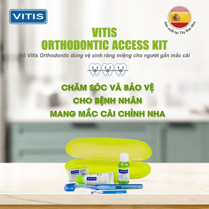 Mua tại TiktokBộ sản phẩm chăm sóc răng chỉnh nha, gắn mắc cài Vitis Orthodontic Access Kit dành cho mọi đối tượng người sử dụng có nhu cầu mang theo khi du lịch và đang trong quá trình chỉnh hình bằng mắc cài, người đang đeo khí cụ chỉnh nha với công thức đặc biệt giúp tăng cường và tái khoáng hóa men răng, giảm thiểu sự hình thành mảng bám, làm mềm mảng bám giúp người sử dụng vệ sinh răng miệng được hiệu quả hơn, hạn chế tình trạng lở loét do các dụng cụ chỉnh hình cọ xát với niêm mạc miệng Bộ sản phẩm bao gồm: