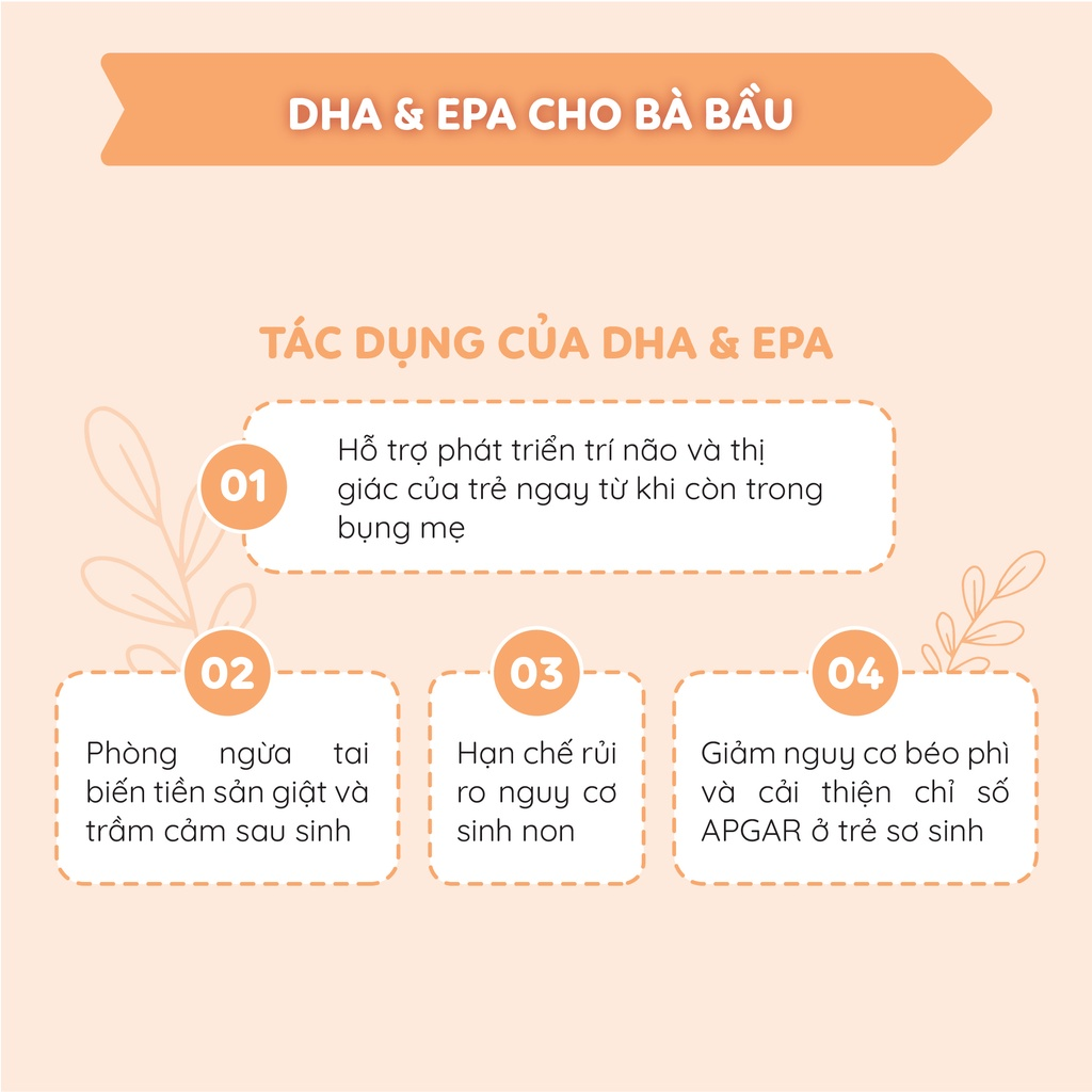- Phụ liệu: Gelatin, Glycerin. Đặc điểm nổi bật Bổ sung Omega 3 chứa DHA và EPA cho phụ nữ trong các giai đoạn chuẩn bị mang thai, đang mang thai và cho con bú Giàu vitamin E gốc thực vật