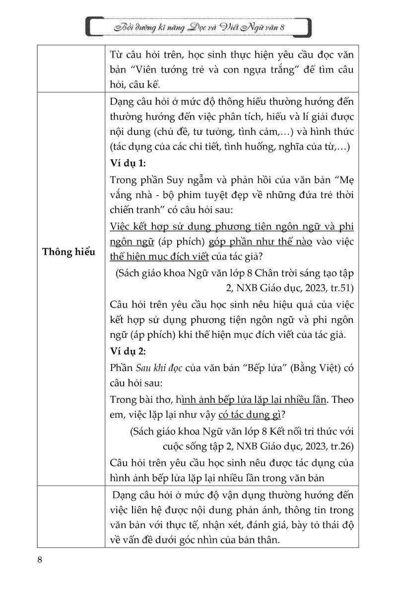 Cuốn sách “BỒI DƯỠNG KĨ NĂNG ĐỌC VÀ VIẾT NGỮ VĂN 8” sẽ giúp học sinh rèn luyện, phát triển kĩ nǎng Đọc, Viết, định hướng cách làm bài hiệu quả, phù hợp. Các em dễ tiếp cận, nắm được cách làm bài tập Đọc, Viết trong chường trình Ngữ vǎn lớp 8 mới, cải thiện, phát triển tư duy ngôn ngữ qua việc tự rèn luyện hai kĩ nǎng quan trọng (đọc, viết) khi học môn Ngữ vǎn. Thông qua mỗi đề luyện tập, học sinh có thể mở rộng vốn hiểu biết của bản thân về những vấn đề trong cuộc sống liên quan đến các chủ đề, bồi đắp tình yêu quê hương, đất nước nói chung, vǎn chương nói riêng đồng thời biết giữ gìn, phát huy giá trị của tiếng Việt đối với đời sống hiện nay. Cuốn sách “BỒI DƯỠNG KĨ NĂNG ĐỌC VÀ VIẾT NGỮ VĂN 8” còn là nguồn tài liệu bổ ích để các thầy cô có thể tham khảo, hướng dẫn học sinh rèn luyện kĩ nǎng Đọc và Viết thật hiệu quả.