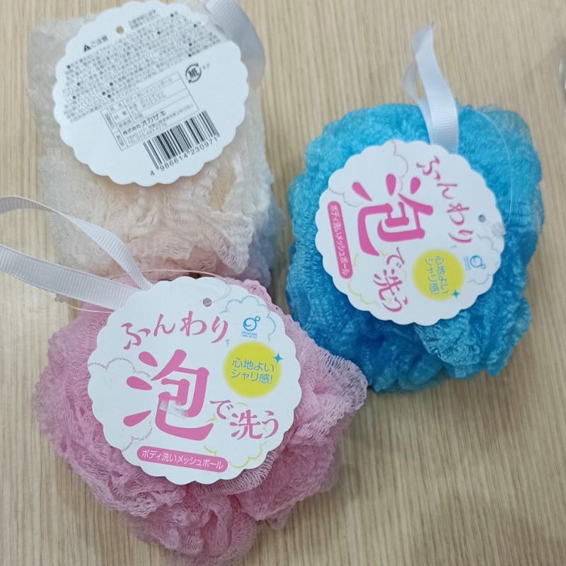 Bông tắm tạo bọt Okazaki Ø130mm THÔNG TIN SẢN PHẨM  Xuất xứ: Nhật Bản - Màu sắc: Màu hồng/ xanh/ trắng kem(giao ngẫu nhiên) - Kích thước: Ø13x13x12cm - Chất liệu:Sợi tổng hợp Vinyl, bề