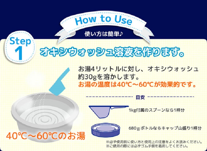 - HDSD: Hòa tan khoảng 30 gram bột OXI WASH vào 04 lít nước ấm hoặc 8g cho 01 lít nước ấm 40~60 độ C, ngâm các đồ vật/ vật dụng cần tẩy trắng vào trong dụng dịch đã pha khoảng từ 5~10 phút sau đó tráng lại bằng nước sạch. Được rất nhiều người tiêu dùng tin tưởng lựa chọn. Sản phẩm được sản xuất & nhập khẩu trực tiếp từ Nhật Bản.