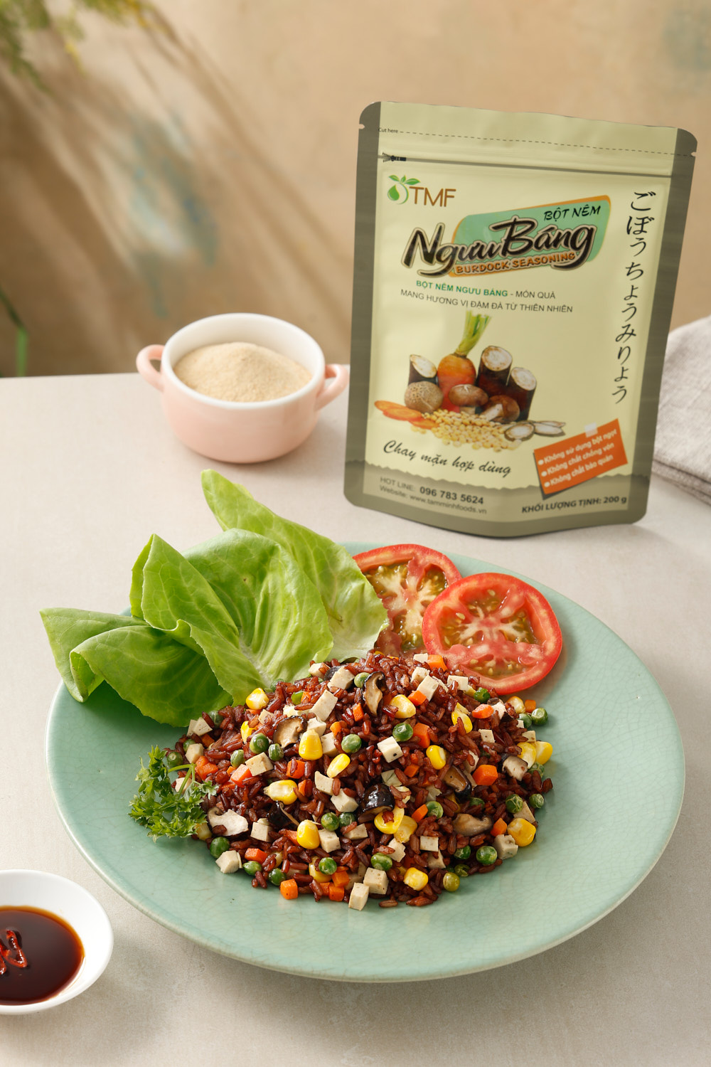 Thành phần: muối, ngưu báng 30%, nấm đông cô, cà rốt, protein đậu nành, chiết xuất lúa mạch, đường vàng.