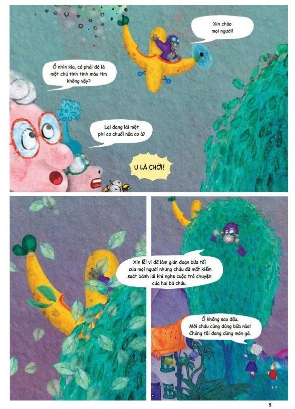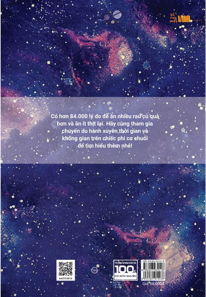 Bớt Thịt Thêm Thương! “Bớt thịt thêm thương” cuốn sách song ngữ dành cho trẻ 6+. Có hơn 84.000 lý do để ăn nhiều rau củ quả hơn và ăn ít thịt lại. Hãy cùng tham gia chuyến du hành xuyên thời gian và không gian trên chiếc phi cơ chuối để tìm hiểu thêm nhé. Trích đoạn sách hay: Nội ơi, cảm ơn bà đã nấu cơm cho cháu. Tối nay, chúng ta sẽ dùng món gì vậy Nội? Bà đã nấu món gà cháu yêu thích rồi đây! Nhưng Nợi ơi, cháu xin lỗi! Cháu nghĩ là m.ình không ăn thịt nữa đâu… Ôi cháu ngoan, bà biết là cháu yêu thương động vật, nhưng cháu cũng cần dùng một chút thịt để lớn nhanh và khoẻ mạnh. Cháu đừng ngại nhé, hãy dùng bao nhiêu gà tuỳ thích! Cảm ơn bà nhưng cháu muốn ăn ra củ quả hơn. Sao chỉ ăn rau củ quả mà cháu khoẻ mạnh thế kia? Thật không thể tin được! Ước gì tớ là một chú tinh tinh khoẻ mạnh! Cậu không cần phải trở thành tinh tinh giống tớ đâu. Con người và “mọi loài động vật” đều có thể trở nên khoẻ mạnh hơn nhờ ăn rau củ quả. Chúng chứa những nguồn dưỡng chất vô cùng bổ dưỡng. Để tớ đưa bà và cậu đi tham quan bằng phi cơ chuối nhé!