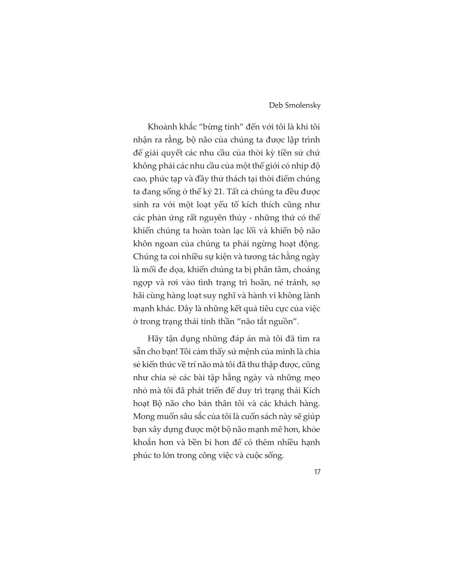 • Phần III: Phương pháp“Kích hoạt Bộ não” dành cho tổ chức, được thiết kế cho các nhà lãnh đạo, bộ phận nhân sự cũng như toàn bộ tổ chức để giúp nhân viên luôn tạo ra một môi trường phát triển mạnh mẽ. Về tác giả: Deb Smolensky là tác giả, diễn giả và nhà lãnh đạo tư tưởng trong lĩnh vực hiệu suất con người và duy trì sức khỏe tại nơi làm việc. Trong 25 năm qua, Deb đã nhận được nhiều chứng nhận về những đóng góp cho năng suất và sức khỏe của tổ chức. Cô tư vấn cho nhiều khách hàng, bao gồm nhiều công ty trong danh sách Fortune 500, để phát triển các chiến lược, chương trình và phương pháp thực hành nhằm tiếp thêm sức mạnh cho nhân viên và đội ngũ điều hành, giúp họ xây dựng cuộc sống lành mạnh, hiệu quả tại nơi làm việc thông qua các giải pháp sáng tạo, giàu ý nghĩa và hấp dẫn. Một số lời khen: “Chúng ta thường đánh giá thấp sức mạnh bên trong bộ não thần kỳ của con người. Trong cuốn sách này, Deb Smolensky đi sâu vào vùng vỏ não trước trán, giới thiệu lại cho chúng ta một cách mạnh mẽ và đầy hứng khởi về những điều có thể xảy ra khi sử dụng trí óc một cách có chủ ý.” DANIEL H. PINK, tác giả những cuốn sách bán chạy nhất: Drive, The Power of Regretvà A Whole New Mind “Deb thấu hiểu những thách thức khi làm việc trong thế giới ngày nay cũng như những cơ hội để cải thiện môi trường làm việc tốt hơn cho các cá nhân và tổ chức. Brain On! là nguồn tài nguyên tuyệt vời để khơi gợi các kỹ năng xã hội quan trọng, nhằm khơi dậy lòng trắc ẩn, năng lượng, hạnh phúc và lòng biết ơn tại nơi làm việc cũng như những ngày làm việc.”