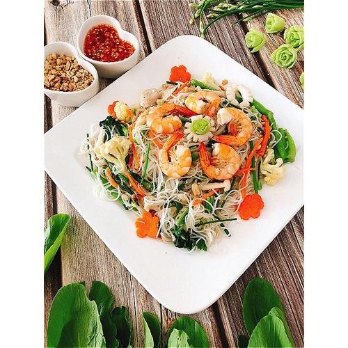 - Dùng để xào: – Ngâm bún trong nước ấn 60 độ C (bằng cách pha 2 phần nước nóng, 1 phần nước lạnh) khoảng 10 phút vớt ra. – Xào tôm, thịt, rau sẵn… Xong cho bún vào xào chung.
