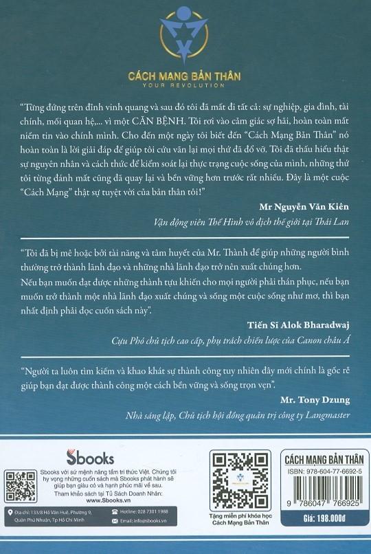 Nguyễn Văn Kiên - Vận động viên Thể Hình vô địch thế giới tại Thái Lan Từng đứng trên đỉnh vinh quang và sau đó tôi đã mất đi tất cả: "Sự nghiệp, gia đình, tài chính, mối quan hệ,... vì một CĂN BỆNH... Tôi rơi vào cảm giác sợ hãi, hoàn toàn mất niềm tin vào chính mình. Cho đến một ngày tôi biết đến “Cách Mạng Bản Thân” nó hoàn toàn là lời giải đáp để giúp tôi cứu vãn lại mọi thứ đã đổ vỡ. Tôi đã thấu hiểu thật sự nguyên nhân và cách thức để kiểm soát lại thực trạng cuộc sống của mình, những thứ tôi từng đánh mất cũng đã quay lại và bền vững hơn trước rất nhiều. Đây là một cuộc “Cách Mạng” thật sự tuyệt vời của bản thân tôi."   TS. Alok Bharadwaj - Cựu Phó chủ tịch cao cấp, phụ trách chiến lược của Canon châu Á Tôi đã bị mê hoặc bởi tài năng và tâm huyết của Mr. Thành để giúp những người bình thường trở thành lãnh đạo và những nhà lãnh đạo trở nên xuất chúng hơn. " Nếu bạn muốn đạt được những thành tựu khiến cho mọi người phải thán phục, nếu bạn muốn trở thành một nhà lãnh đạo xuất chúng và sống một cuộc sống như mơ, thì bạn nhất định phải đọc cuốn sách này".