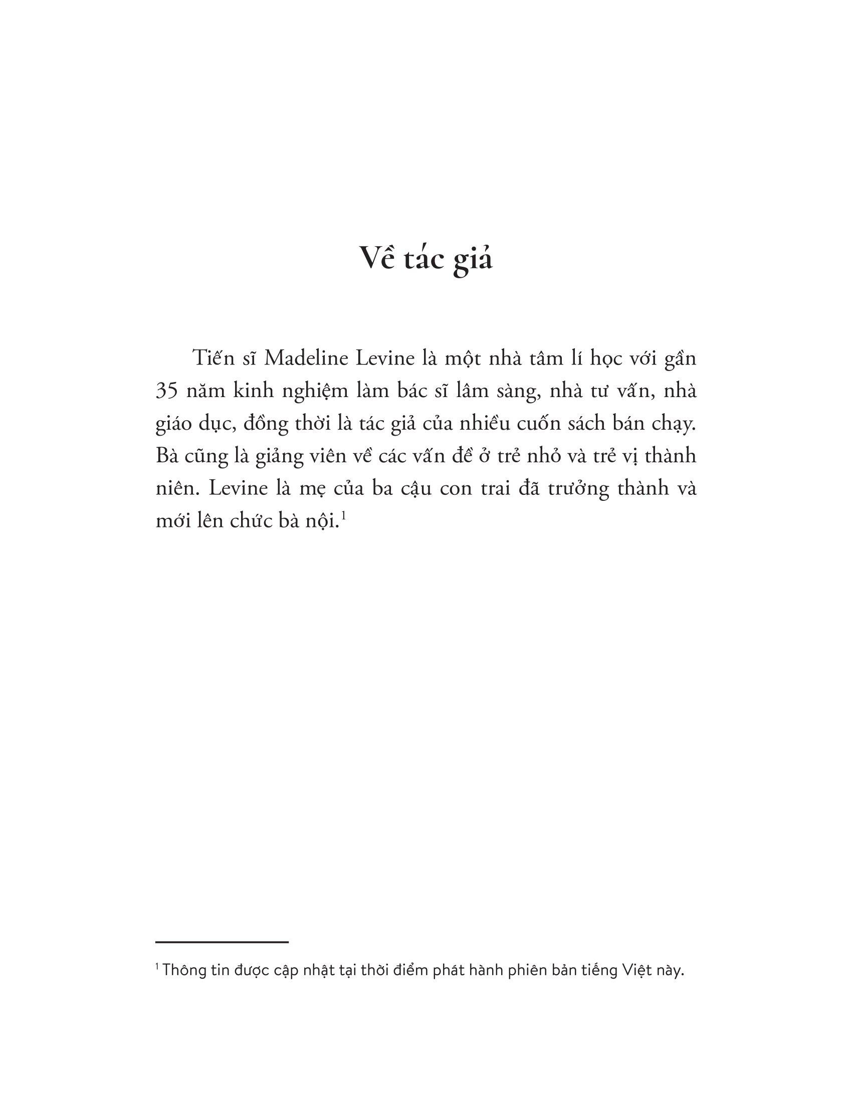 “Điều khiến tôi biết ơn hơn cả là Levine không chỉ giúp chúng ta nhận biết, nhìn tỏ vấn đề, mà còn đưa ra rất nhiều công cụ, giải pháp để giúp mỗi người có thể hình thành chiến lược của riêng m.ình trong hành trình nuôi dạy nên những đứa trẻ hạnh phúc, tự tin và tự chủ. Đây thực sự là cuốn sách cần thiết đối với các bậc cha mẹ hiện đại!