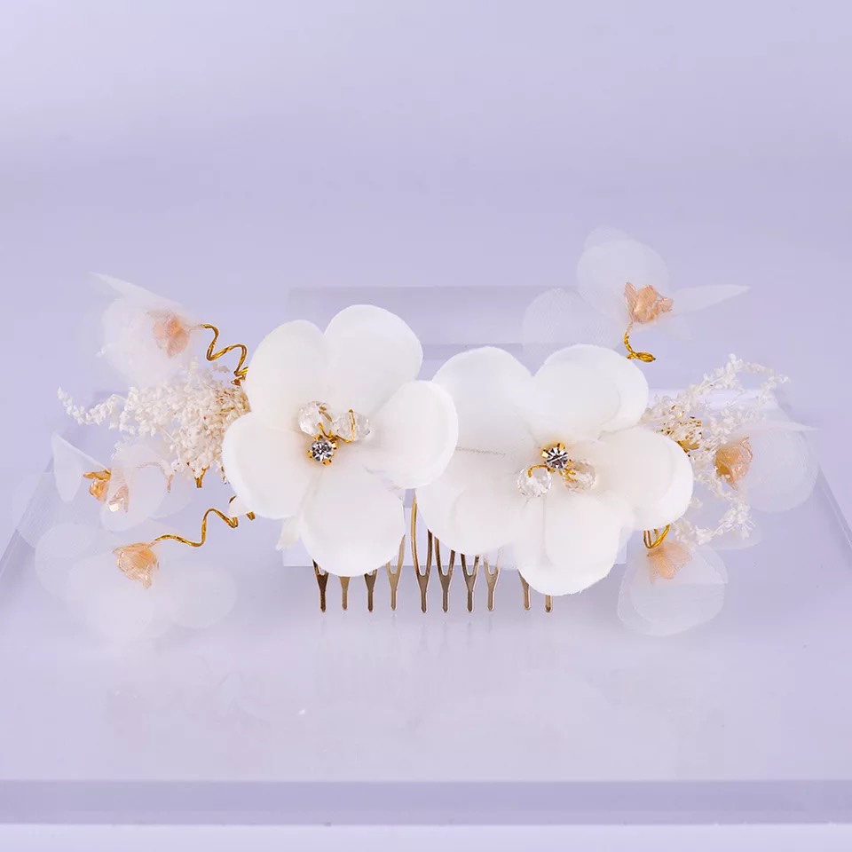 Trâm cài tóc cô dâu thiết kế ngọc trai và hoa 5 canh mềm mại, nữ tính. Tôn lên vẻ đẹp cho mái tóc xinh. Thích hợp trang điểm, make up cô dâu, trang điểm