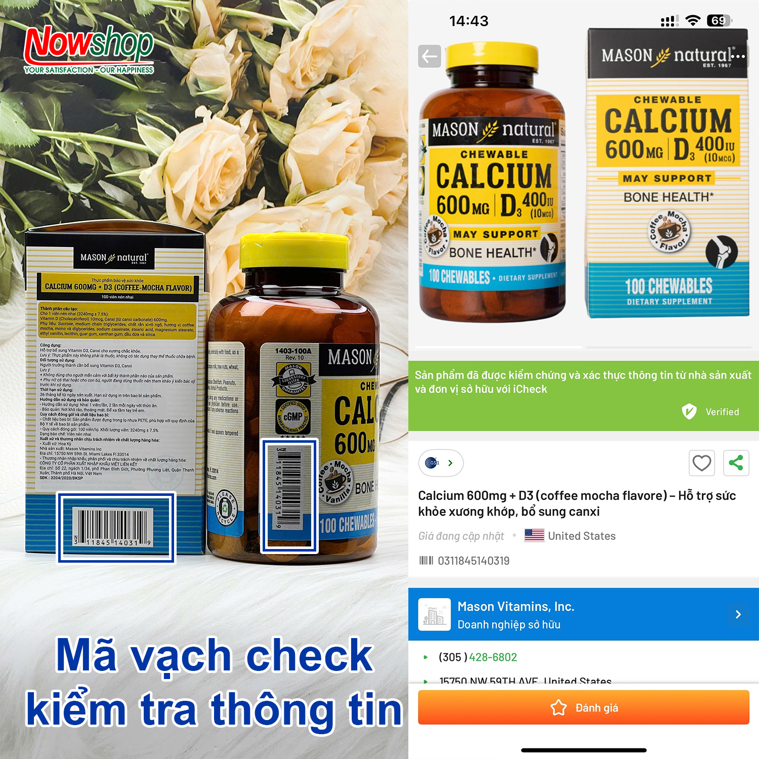 Mason Calcium 600mg + D3 400IU - Bổ sung Canxi & Vitamin D3 giúp hấp thu hiệu quả - Dành cho mọi độ tuổi!