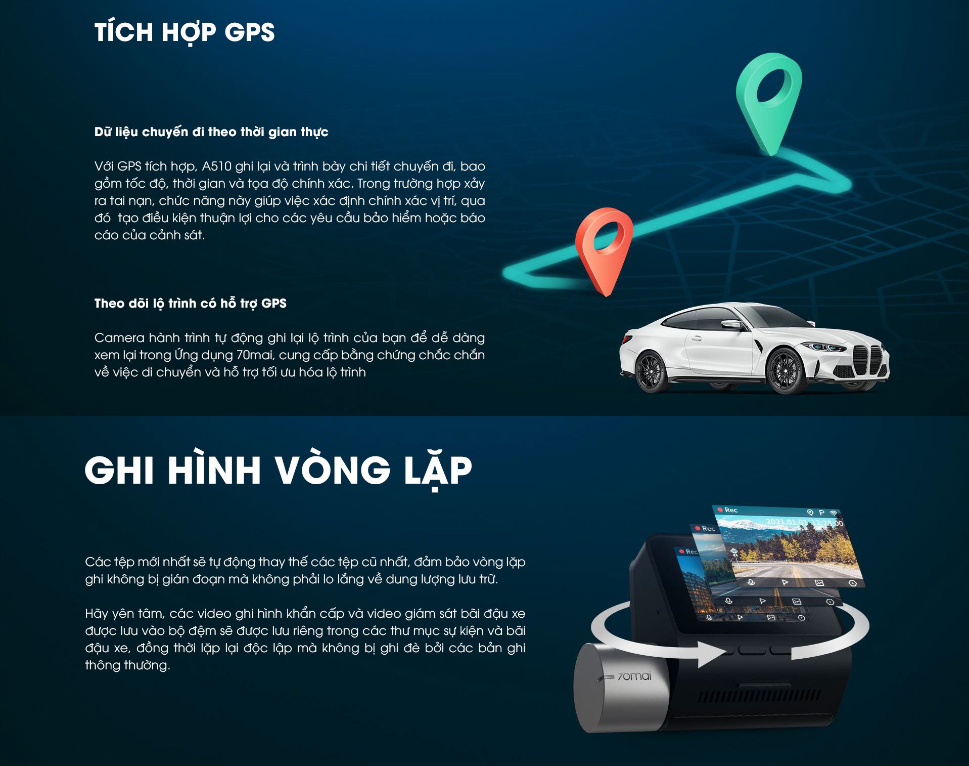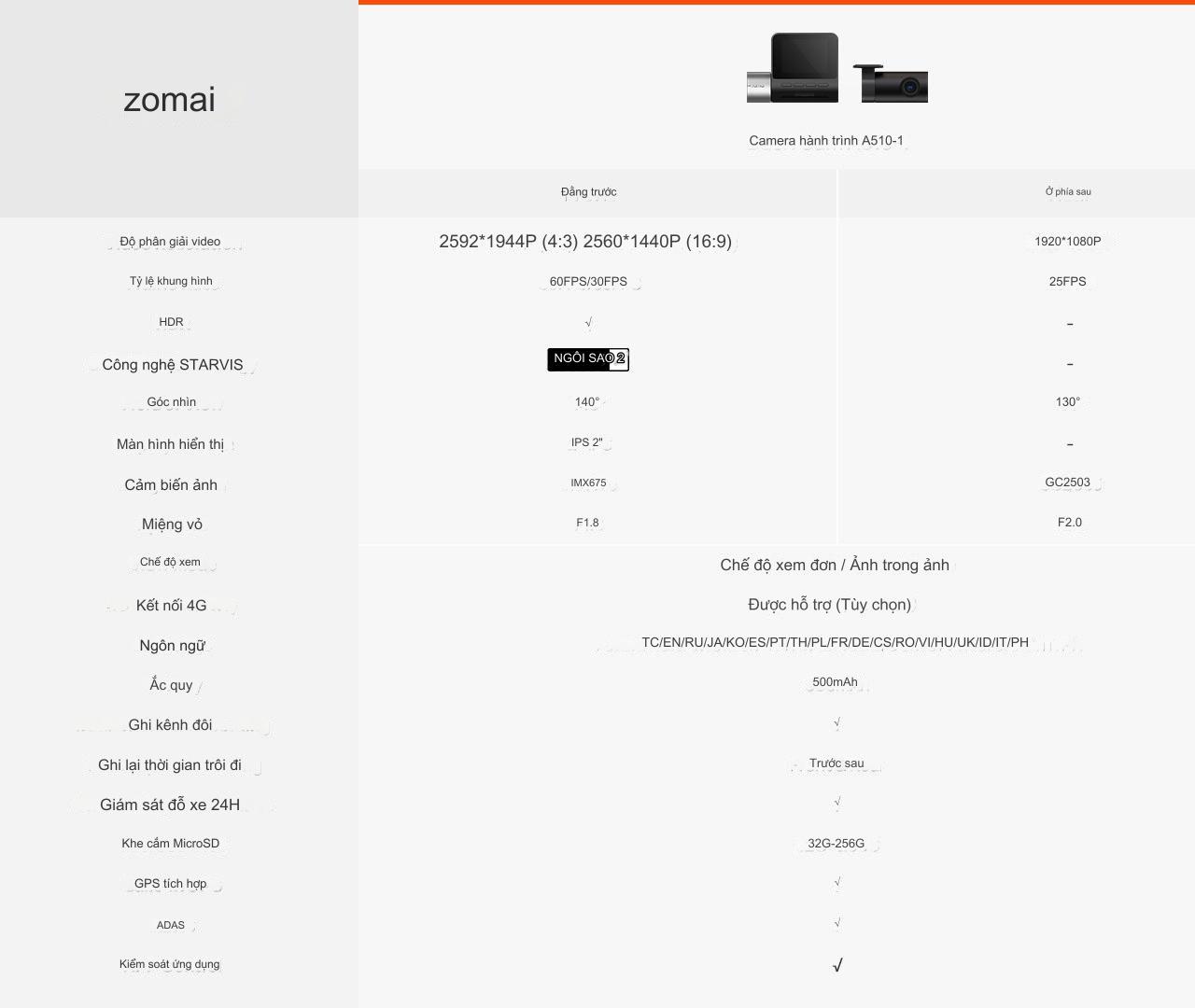 Độ phân giải video : 2K 1440P Ống kính : Camera trước 150° Ghi hình vòng lặp : Có Wifi : Có GPS : Có Công nghệ hình ảnh giảm nhiễu Hỗ trợ tái hiện