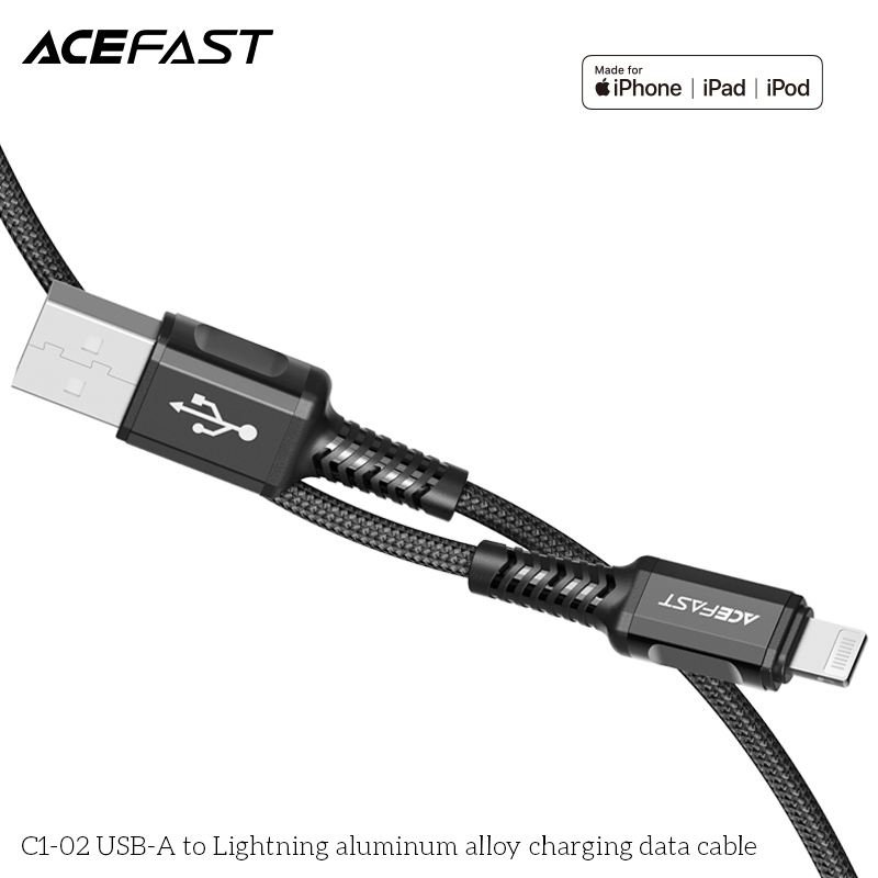 Cáp ACEFAST C3-02 , dòng điện lên đến 2,4A, chiều dài 1.2m, chất liệu TPE, chứng nhận M.F.I Thông số kỹ thuật: - - Chiều dài: 1.2m. Trọng lượng: 30g. - - Chất liệu vỏ bên ngoài:
