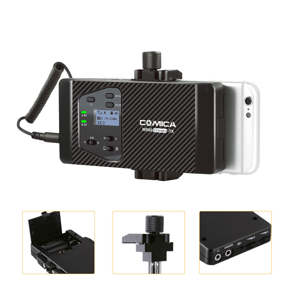 • WS60 COMBO is a Flexible Mini wireless microphone with dual-transmitter triggered by one receiver, which charged by three AAA batteries; It utilizes UHF wireless FM technology and LCD high-resolution lattice screen, 10-level adjustable volume, and is integrated into LCF(Low cut filter), Stereo/Mono switchable audio mode, MIC/LINE IN Input Mode Automatically, Smartphone/Camera Mode Switch, Sound pick up dynamic display and other functions; Meanwhile the high-quality microphone comes with strong shielding anti-noise performance equals broadcast level.