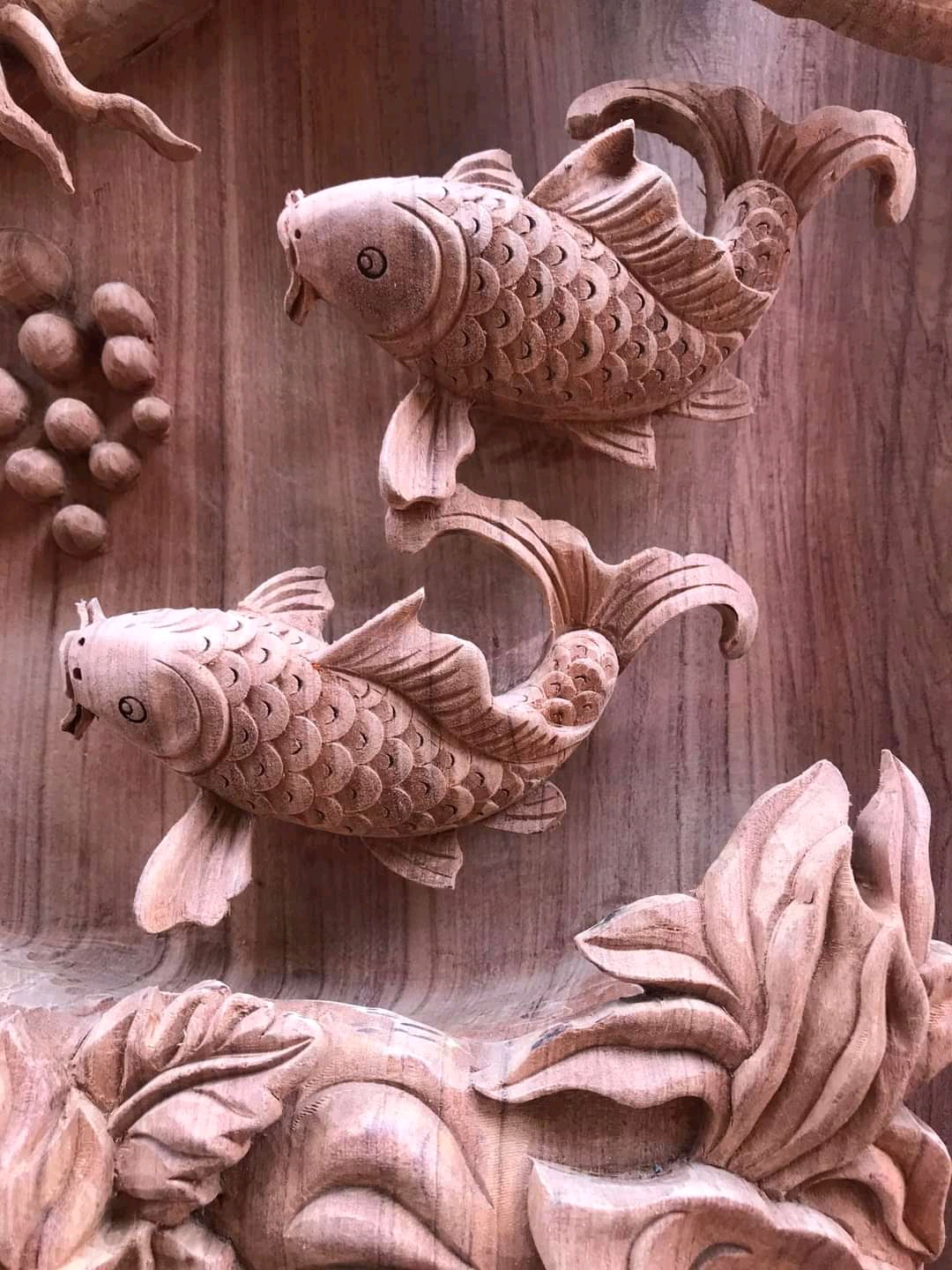 Tranh gỗ hương đục nổi mạ vàng - CẶP CÁ CHÉP -LÝ NGƯ VỌNG NGUYỆT Chất liệu gỗ hương liền khổi đục nổi 5D kênh bong , cực tinh xảo, mạ vàng sơn pu cao