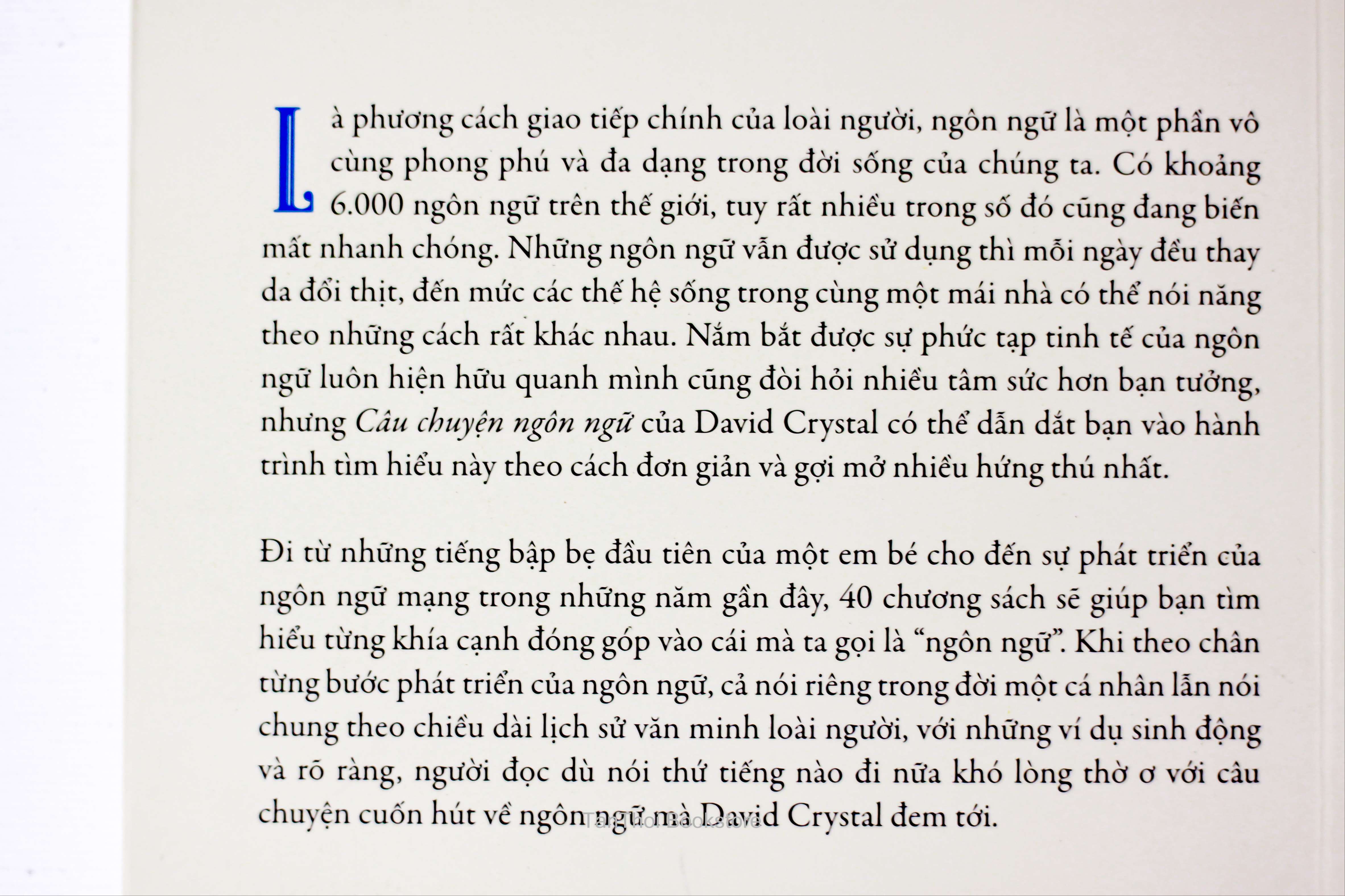 ��Là phương cách giao tiếp chính của loài người, ngôn ngữ là một phần vô cùng phong phú và đa dạng trong đời sống của chúng ta. Có khoảng 6.000 ngôn ngữ trên thế giới, tuy rất nhiều trong số đó cũng đang biến mất nhanh chóng. Những ngôn ngữ vẫn được sử dụng thì mỗi ngày đều thay da đổi thịt, đến mức các thế hệ sống trong cùng một mái nhà có thể nói năng theo những cách rất khác nhau. Nắm bắt được sự phức tạp tinh tế của ngôn ngữ luôn hiện hữu quanh mình cũng đòi hỏi nhiều tâm sức hơn bạn tưởng, nhưng Câu chuyện ngôn ngữ của tác giả có thể dẫn dắt bạn vào hành trình tìm hiểu này theo cách đơn giản và gợi mở nhiều hứng thú nhất.