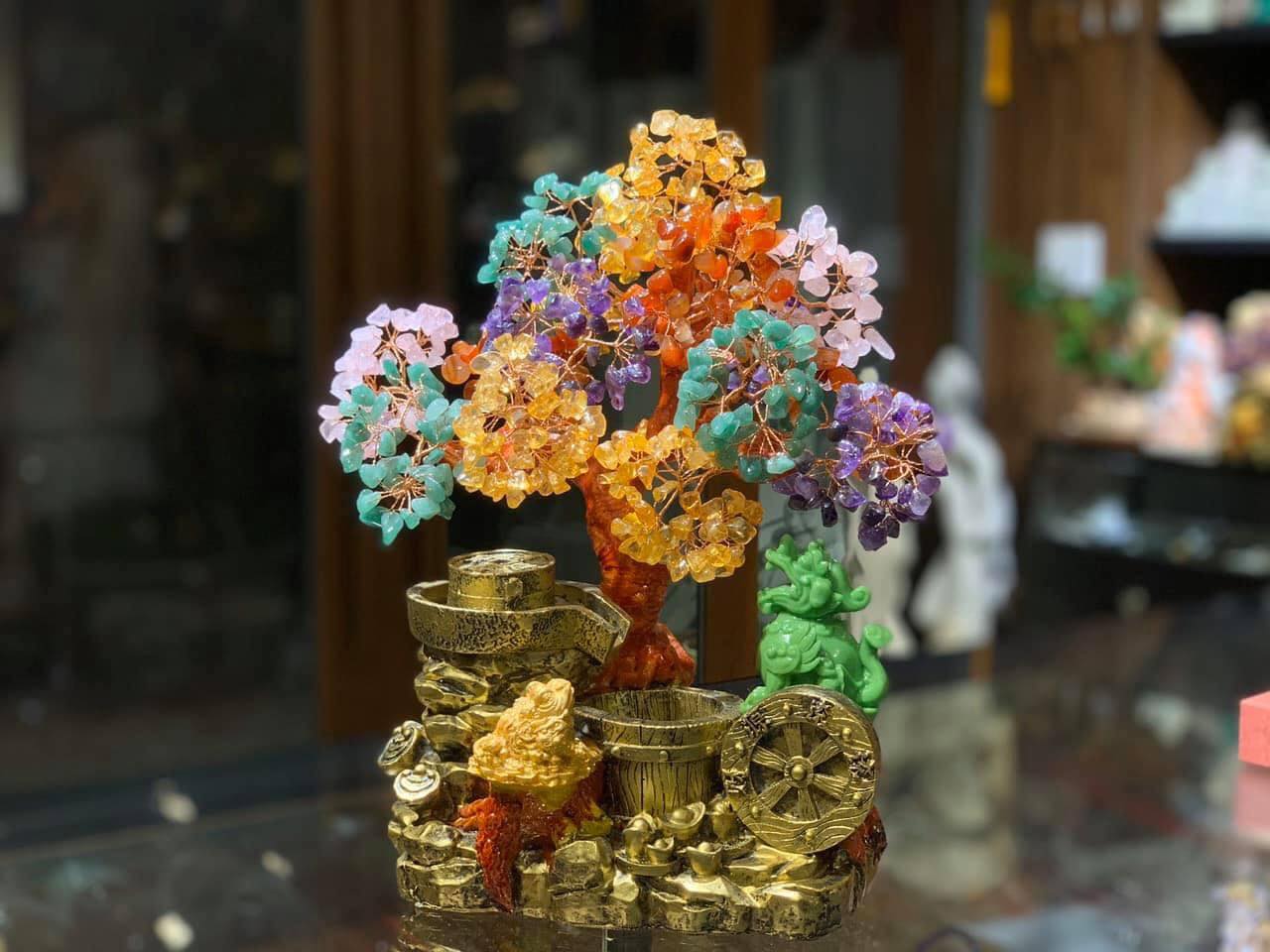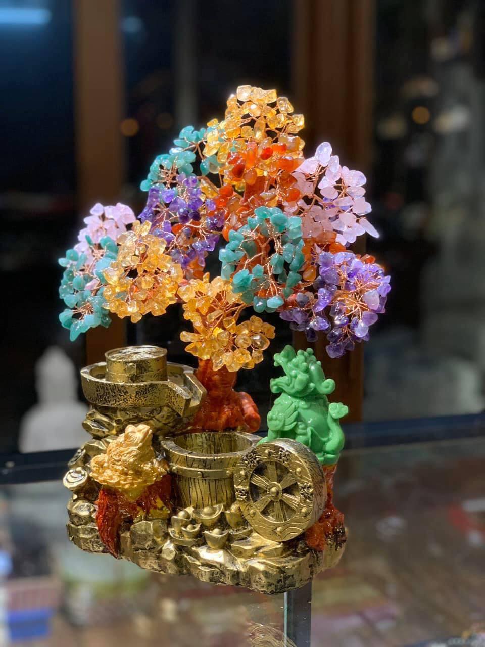 ✨Cây Tài Lộc với tiểu cảnh thiềm thừ cóc ngậm tiền và tỳ hưu phong thủy đá thạch anh ngũ sắc - Cao 30 cm