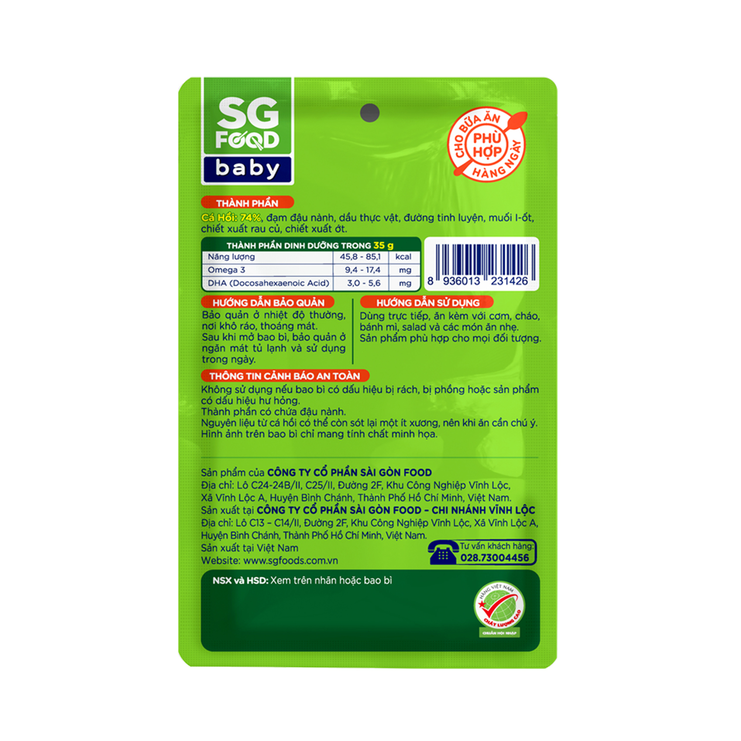 Chà bông cá hồi tươi SGFood 35g Chà Bông Cá Hồi Tươi Sài Gòn Food được sản xuất từ nguyên liệu cá hồi tươi ngon nhập khẩu, hòa quyện cùng các gia vị đặc trưng tạo nên món ăn bổ dưỡng, tròn vị phù hợp khẩu vị của người Việt Nam.   - DINH DƯỠNG: Nguyên liệu cá hồi tươi nhập khẩu >74%, giàu Omega 3 - DHA giúp bé phát triển trí não và thị giác. - AN TOÀN: Không hạt nêm bột ngọt - Không chất bảo quản - Không phẩm màu tổng hợp. - CÔNG NGHỆ NHẬT BẢN: có thể bảo quản ở nhiệt độ thường đến 12 tháng nhưng vẫn giữ được dinh dưỡng và hương vị tươi ngon của cá hồi. Cá Hồi: 74%, đạm đậu nành, dầu thực vật, đường tinh luyện, muối I-ốt, chiết xuất rau củ, chiết xuất ớt. Dùng trực tiếp, ăn kèm với cơm, cháo, bánh mì, salad và các món ăn nhẹ. Bảo quản ở nhiệt độ thường, nơi khô ráo, thoáng mát. Sau khi mở bao bì, bảo quản ở ngăn mát tủ lạnh và sử dụng trong ngày.