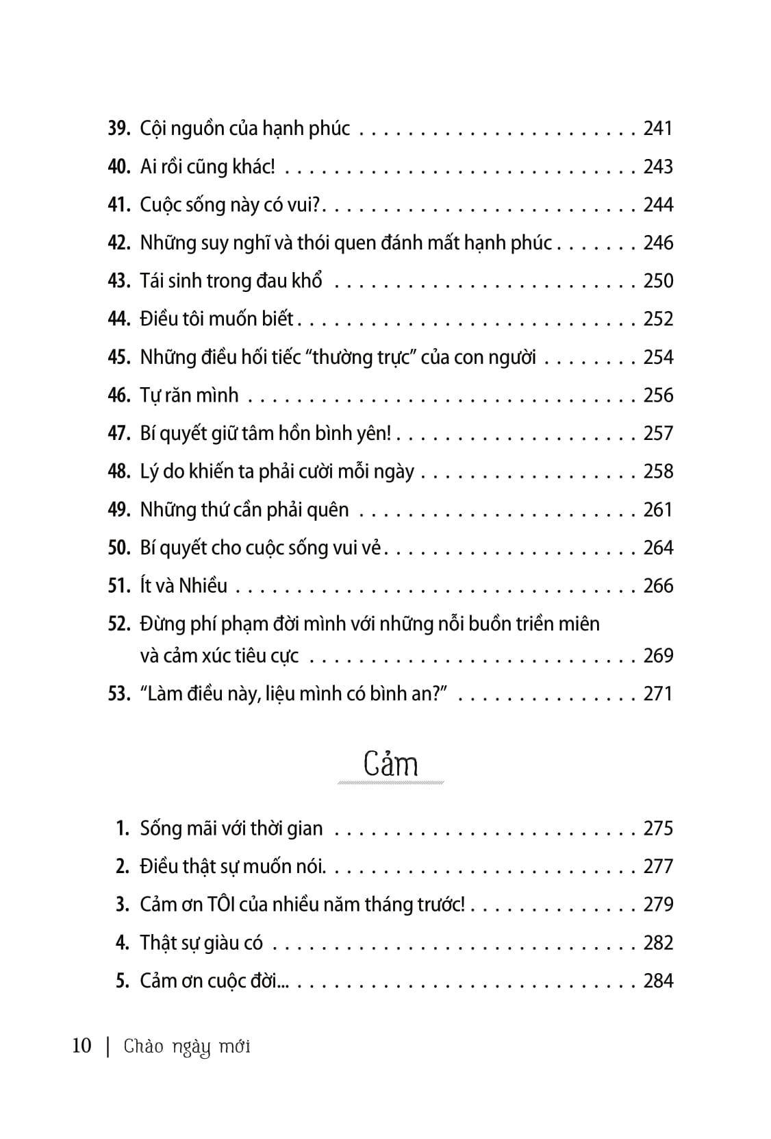 Với Chào ngày mới! tác giả, giống như một lữ khách sau hành trình dài, nhẩn nha ghé lại, tâm tình với độc giả về những suy niệm cuộc sống (Ngẫm), những bài học sâu sắc trên đường đời (Học người) để hoàn thiện bản thân (Răn m.ình). Sau rốt, chính những điều nhỏ bé chạm tới trái tim (Cảm) khiến con người ta càng muốn m.ình trở nên toàn thiện, tốt đẹp và yêu thương cuộc đời hơn. Được viết bằng văn phong giản dị chân tình, những bài viết nhỏ trong cuốn sách này, với đa dạng chủ đề, hàm chứa suy tư của tác giả có thể khiến bạn thấy đâu đó bóng dáng của chính m.ình cùng những ưu tư đồng cảm.