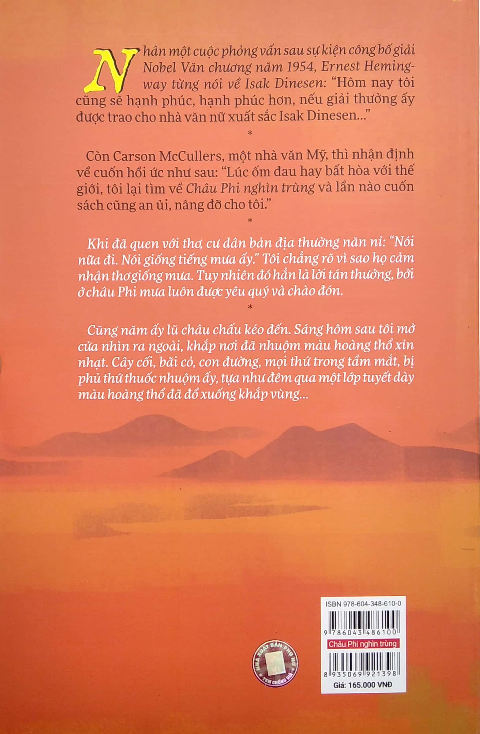 Châu Phi Nghìn Trùng (Tái Bản 2022)Nhân một cuộc phỏng vấn sau sự kiện công bố giải Nobel Văn chương năm 1954, Ernest Hemingway từng nói về Isak Dinesen (dù hai người chưa từng gặp gỡ) như thế này...