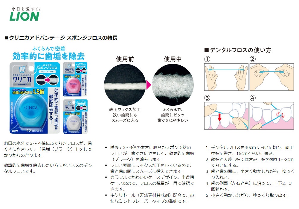 Cuộn chỉ nha khoa Lion Clinica Advantage 40m làm sạch các mảng bám giữa kẽ răng & ngăn ngừa các bệnh lý về răng miệng - Made in Japan: * Chất liệu: Sợi chỉ bằng Polytetrafluorethylene