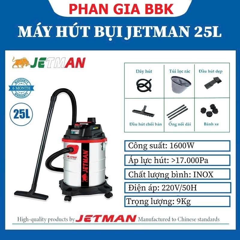 - Máy hút bụi công nghiệp jetman là sản phẩm hút bụi khô và ướt với thiết kế thông minh , có thể hút được ở mọi ngóc ngách như sàn xe , trần xe , ghế ngồi ,... chuyên dùng cho các garage oto cũng như gia đình mà được khách hàng đánh giá cao hiện nay.