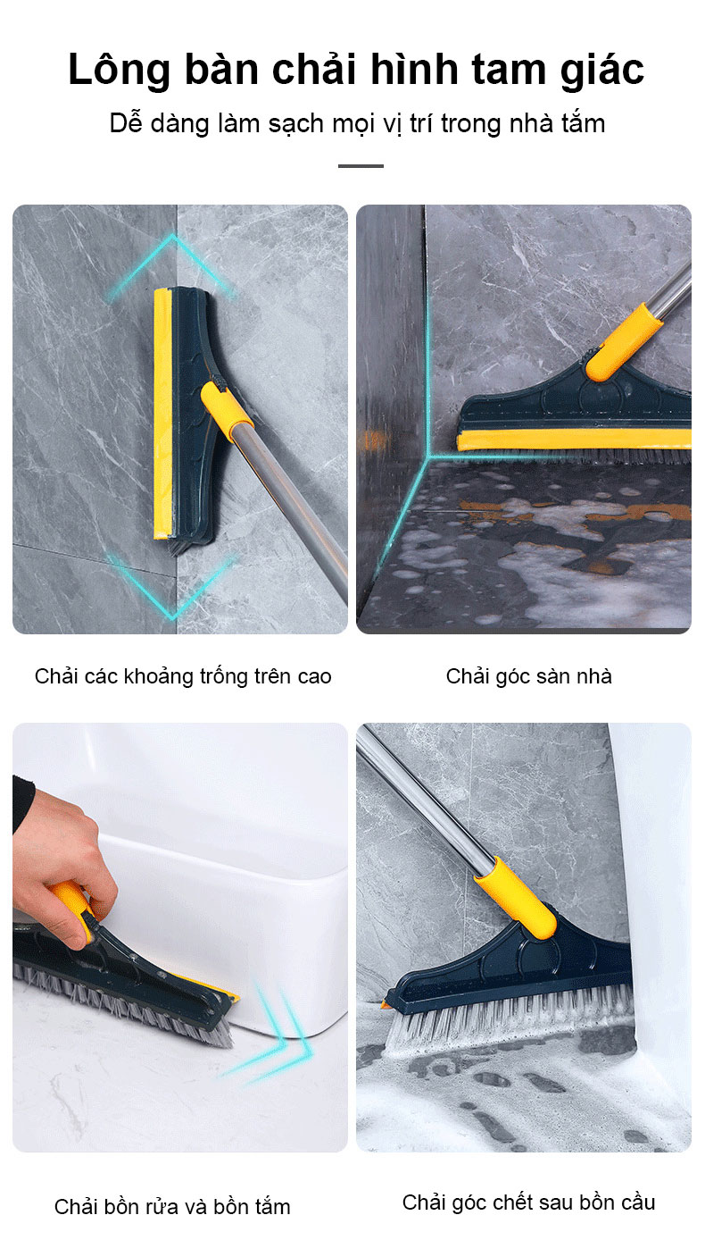 Chổi Chà Sàn Nhà Tắm Thông Minh Thiết Kế Đầu Gạt Nước Và Đầu Chổi Xoay 120 Độ Quét Nhà Siêu Sạch Mọi Góc Bẩn - Hàng Loại 1. CHính Hãng MINIIN     Thiết Kế Đầu Gạt Nước Và Đầu Chổi Xoay 120 Độ Dọn Sạch Mọi Góc Bẩn ️ Chổi lau sàn 120 độ có thể tháo lắp từng khúc để tùy chỉnh chiều dài tùy vào mục đích sử dụng như lau sàn, làm chổi gạt nước trên sàn, lau trên kính trong phòng tắ ️ Năm hàng lông chải cứng cáp giúp đánh bay những vết bẩn cứng đầu ️ Đầu chổi Hình tam giác nhọn linh hoạt gạt sạch mọi bụi bẩn trong từng ngóc ngách nhỏ nhất ️ Thiết kế thông minh với đầu chổi quét kèm đầu gạt nước vô cùng tiện lợi ️ Khớp nối đầu cán chổi có thể điều chỉnh xoay ngang 120 độ giúp bạn đưa chổi vào các góc nhỏ hẹp để lau sạch mọi ngóc nghách khó lau chùi nhất. ️ Bề ngang chổi : 23cm. Chiều dài 112cm ️ Chất liệu nhựa ABS và nhựa PVC cứng cáp, bền chắc. Màu sắc;XÁM XANH SHOP GIAO MÀU NGẪU NHIÊN