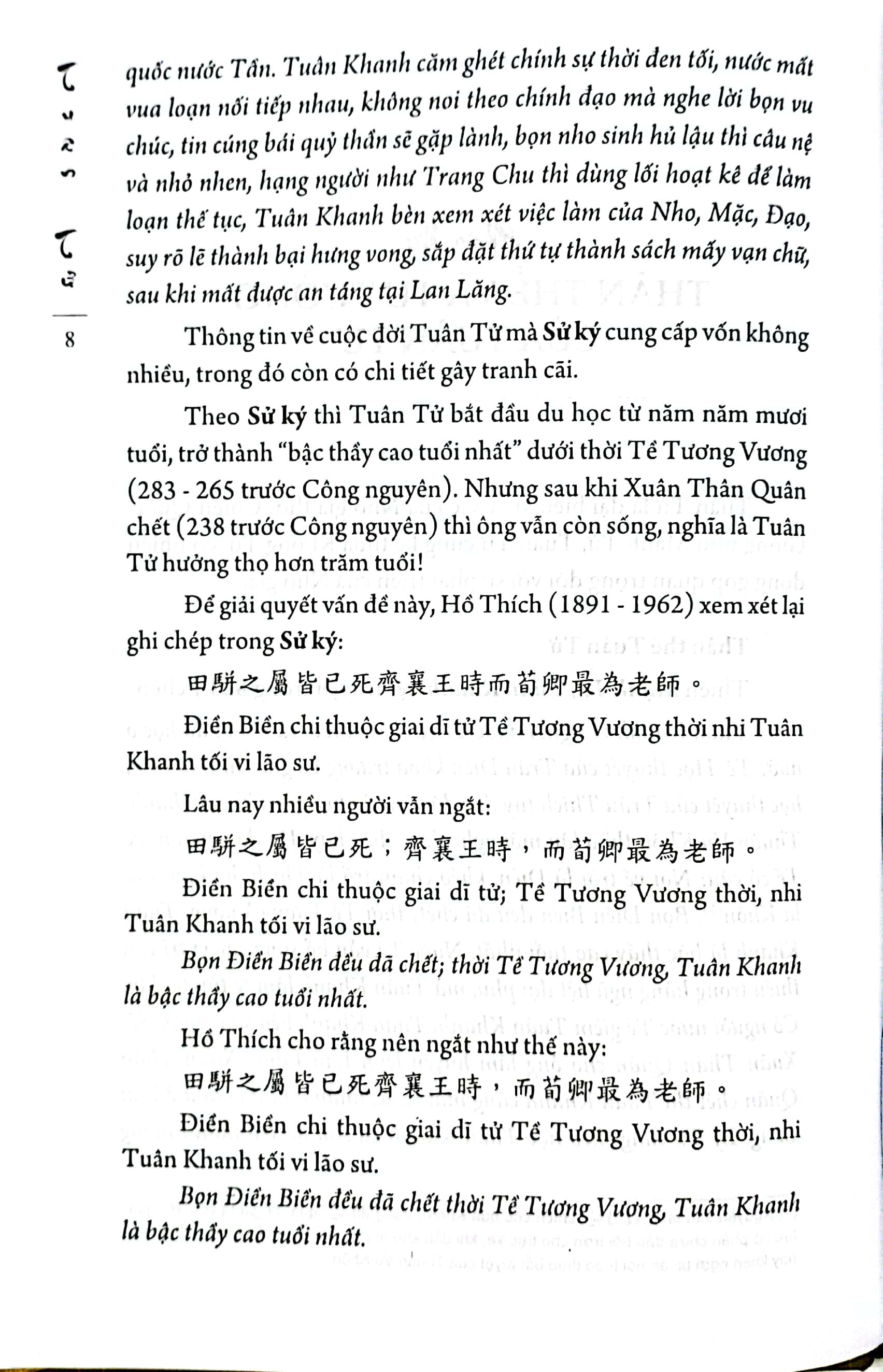 Tuân Tử là đại biểu xuất sắc của Nho gia thời Chiến Quốc. Giống như Mạnh Tử, Tuân Tử cũng kế thừa Khổng Tử, có nhiều đóng góp quan trọng đối với sự phát triển của Nho gia. Nếu như ví Khổng Tử với Socrate ở phương Tây, vậy thì Mạnh Tử sẽ là Plato, còn Tuân Tử chính là Aristotle. Ông là một nhà nho khá đặc biệt trong lịch sử nho học, cũng là một nhà nho gây ra nhiều tranh cãi, thậm chí còn bị chối bỏ. Song tư tưởng của Tuân Tử rất mới mẻ và độc đáo, không câu nệ điều gì, cũng không dựa vách người xưa. Và như cụ Phan Bội Châu đã nói, “chúng ta đối với Tuân, sở dĩ đáng kính phục, đáng sùng bái là vì chốn ấy; nhưng hậu nho sở dĩ hay công kích thầy Tuân cũng vì chốn ấy”.