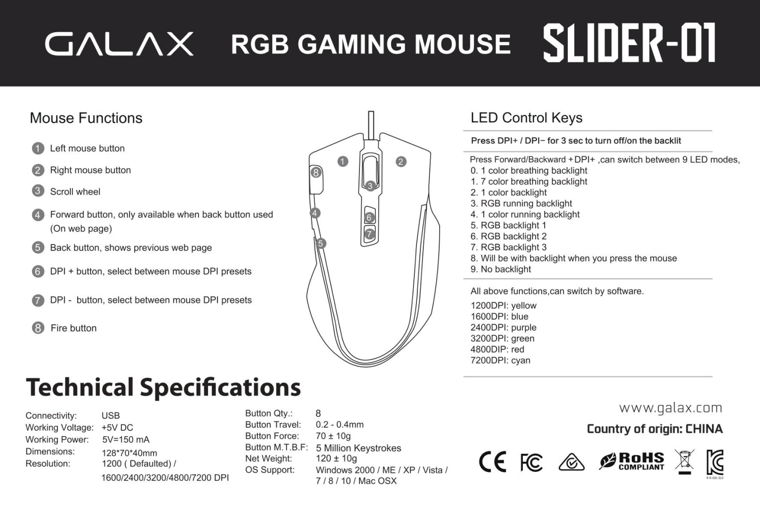Tình trạng: Mới 100% Bảo hành: 06 Tháng Xuất xứ: Chính hãng Thương hiệu: Galax Model: SLIDER-01 DPI: 7200 Sensor: Optical Độ dài dây: 1.8 M Độ bền: 3 triệu lần nhấn Kêt nối: USB