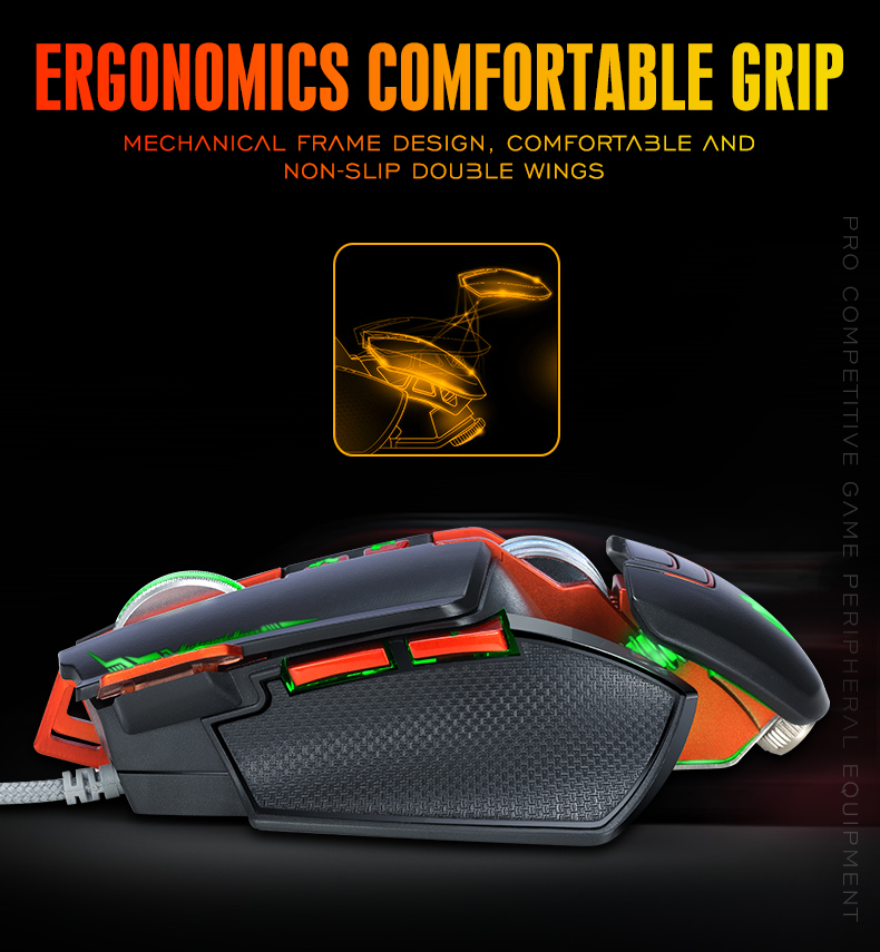 Chuột chơi Game có đèn nền Cổng kết nối: USB Kích thước: 113*63*38mm DPI: 800-1000-1200DPI Tuổi thọ switch: 3,000,000 lần nhấn Độ dài cáp kết nối: 1.5m