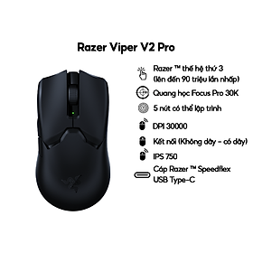 Tham khảo thêm tại: tindocongnghe.vn Chuột Razer Viper V2 Pro Razer cho ra mắt chuột Viper V2 Pro, nhẹ hơn 20% so với dòng Viper Ultimate trước đây. Thế hệ chuột gaming này của Razer có sự kết hợp của switch thế hệ mới, tuổi thọ pin tốt hơn và cảm biến quang học Focus Pro 30K. Sự kết hợp đã giúp Viper V2 Pro trở thành thế hệ chuột gaming mang đến cho người dùng những trải nghiệm esport mới. Được lựa chọn bởi những game thủ hàng đầu Là một dòng chuột đã được khẳng định trong cộng đồng, phiên bản mới Viper v2 này tiếp nối được những giá trị cốt lõi cộng thêm những cải tiến đáng kể giúp nâng cao hơn trải nghiệm của game thủ. Cảm biến Quang học Razer Focus Pro 30k Một trong những cảm biến tốt nhất trên thị trường ở thời điểm hiện tại với những công nghệ như tracking thông minh, đồng bộ chuyển động của thao tác tay với con trỏ chuột trên màn hình một cách tốt nhất, và hơn nữa với cảm biến này khả năng sử dụng đã được nâng cấp khi có thể thao tác trên một bề mặt lớn hơn, sử dụng ngay cả trên kính. Theo Razer, cảm biến quang học Focus Pro 30K mới giúp Viper V2 Pro đạt được độ phân giải chính xác đến 99,8%. Cảm biến này được trang bị tính năng AI (trí tuệ nhân tạo) như Smart Tracking, Motion Sync và Asymmetric Cut-off giúp game thủ nâng cao hiệu suất đến mức cao ở các cấp độ chơi khó. Tính năng Asymmetric Cut-off Tính năng Asymmetric Cut-off đã được cải tiến để có thể hỗ trợ điều chỉnh độ cao chi tiết lên đến 26 cấp độ, so với chỉ 3 cấp độ ở phiên bản trước. Việc mở rộng phạm vi tùy chỉnh cho phép người dùng linh hoạt tinh chỉnh khoảng cách tối đa nhấc chuột và khoảng cách hạ chuột để phù hợp với lối chơi của bạn. Thiết kế siêu nhẹ Ở phiên bản mới này, trọng lượng chuột đã được giảm xuống còn 58g, trải nghiệm tốt hơn bao giờ hết. Switch chuột Razer quang học thế hệ thứ 3 Không double click, không bị xuống cấp hoặc delay khi sử dụng. Mang lại cảm giác của switch tactile (loại switch mỗi khi nhấn cho cảm giác có nấc và phản hồi tốt) và tuổi thọ nhấp chuột lâu hơn, Viper V2 Pro cùng Switch quang học Razer Gen-3 mới loại bỏ sự cố nhấp đúp và độ trễ khi gỡ lỗi. Các switch mới này được sắp xếp để chuột có vòng đời đến 90 triệu lần nhấp, tăng hơn 25% so với tuổi thọ của switch thế hệ trước. Công nghệ Razer HyperSpeed Wireless Nhanh hơn 25% so với những công nghệ không dây khác, đảm bảo sự liền mạch trong quá trình trải nghiệm game với thời gian sử dụng pin lên đến 80 giờ liên tục và có thể kết nối đến nhiều thiết bị cùng một lúc. Tracking thông minh Thông số kỹ thuật