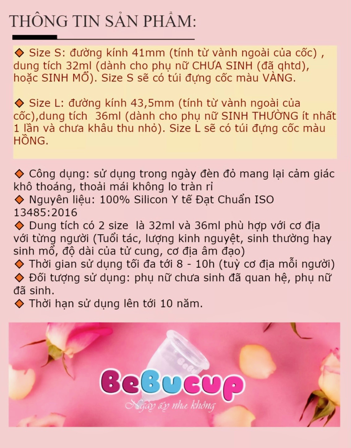 THÔNG TIN SẢN PHẨM - Tên sản phẩm: Cốc nguyệt san Tiêu chuẩn S Cup cỡ S; - Dung tích 30ml, sức chứa tối đa lên đến 12 giờ liên tục; - Đối tượng sử